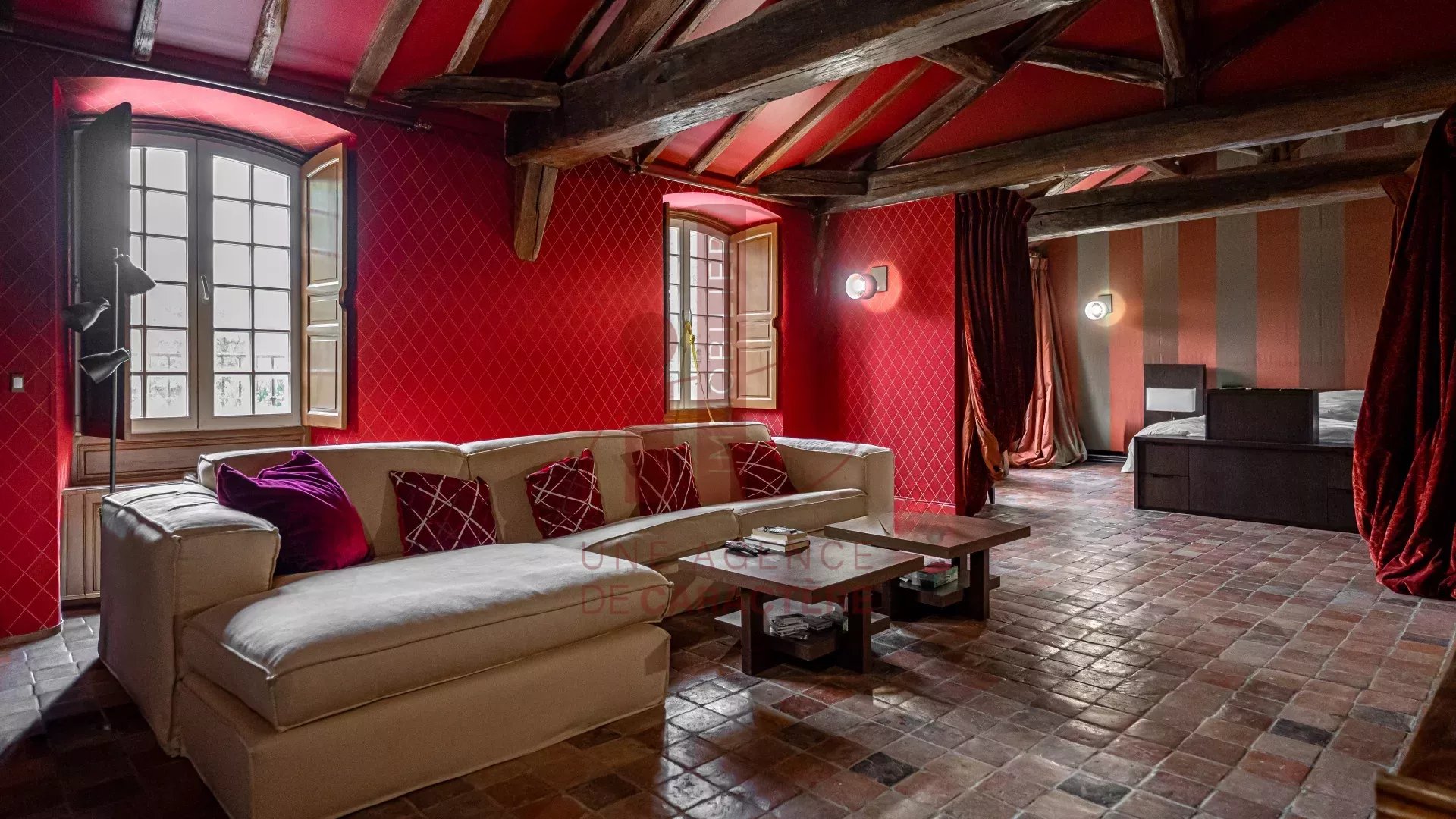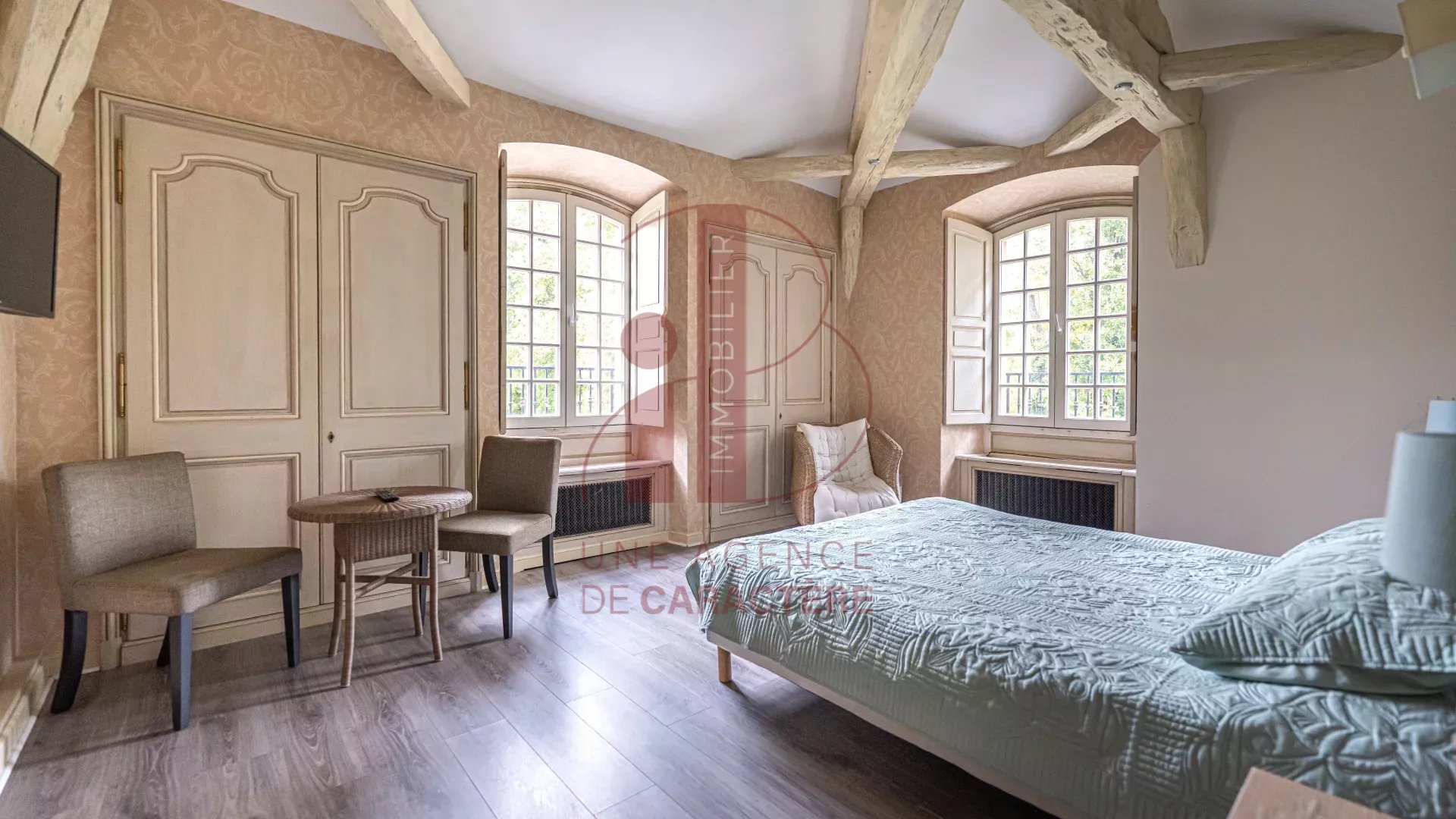 Cathedral living room with exposed beams, air-conditioned master suite with bathroom, shower room, two dressing rooms, two toilets, and three further bedrooms with dressing rooms and private bathrooms.