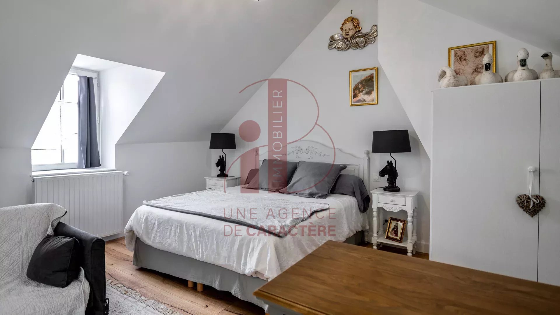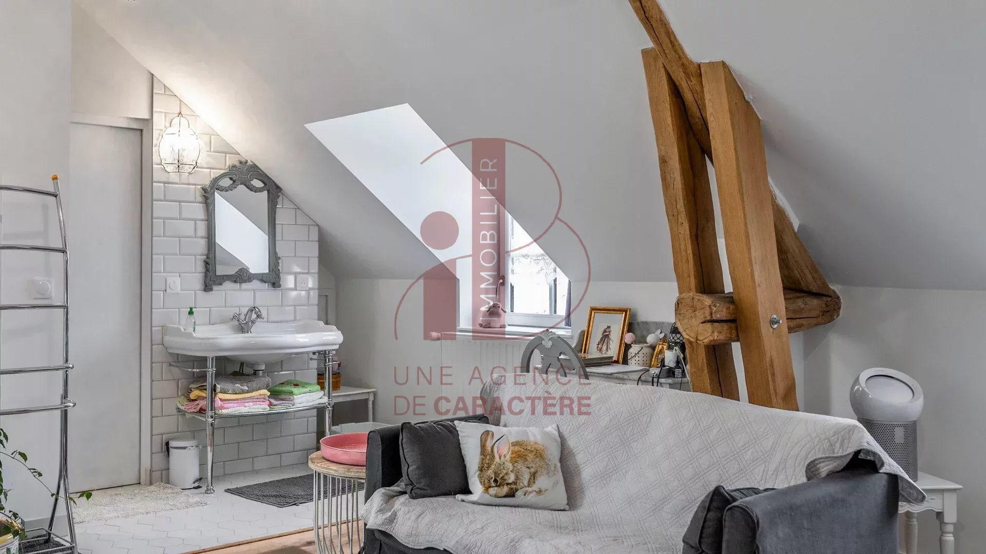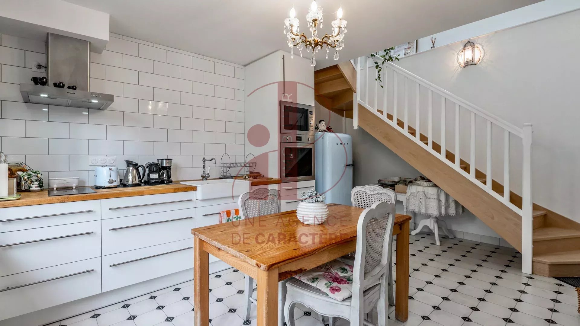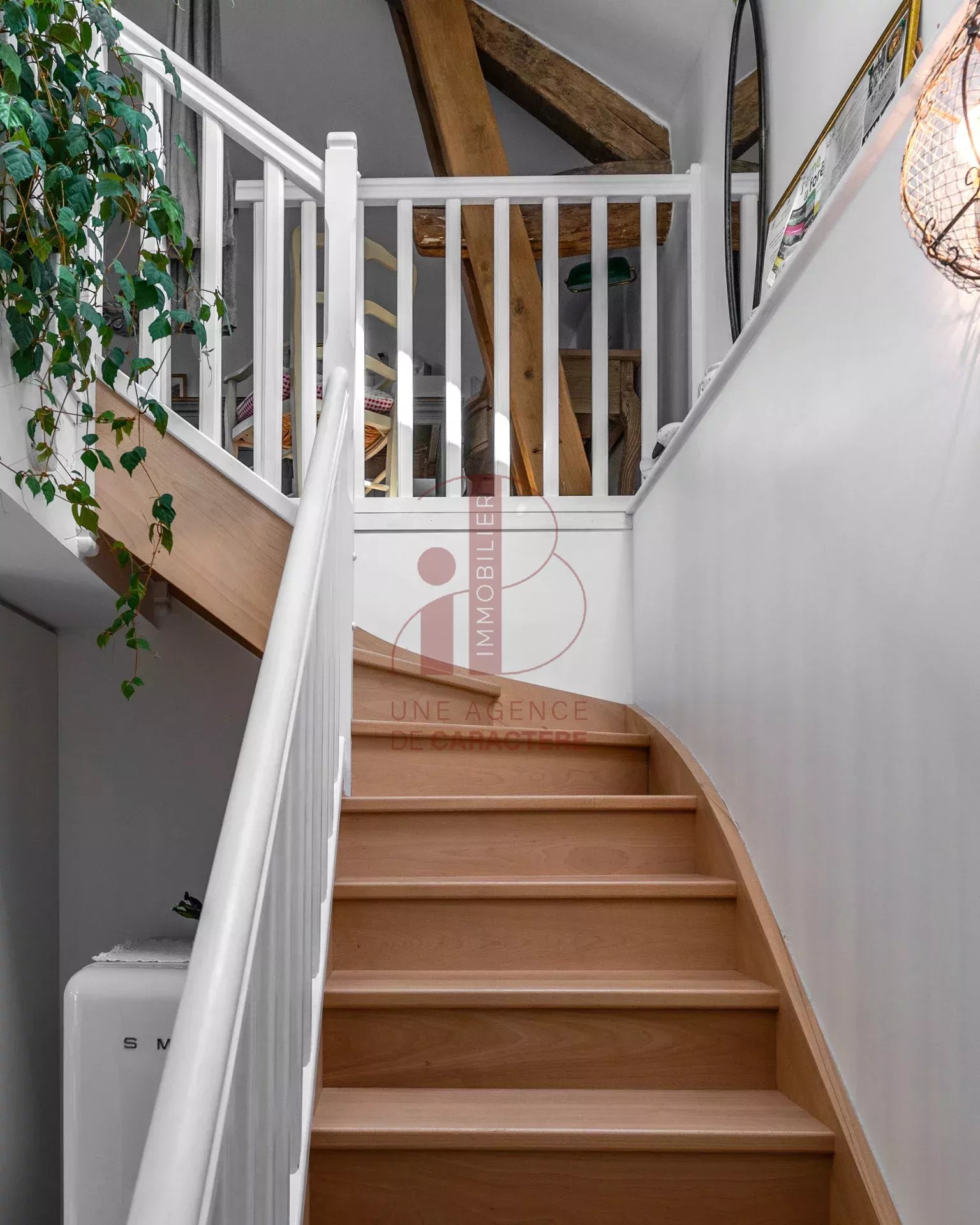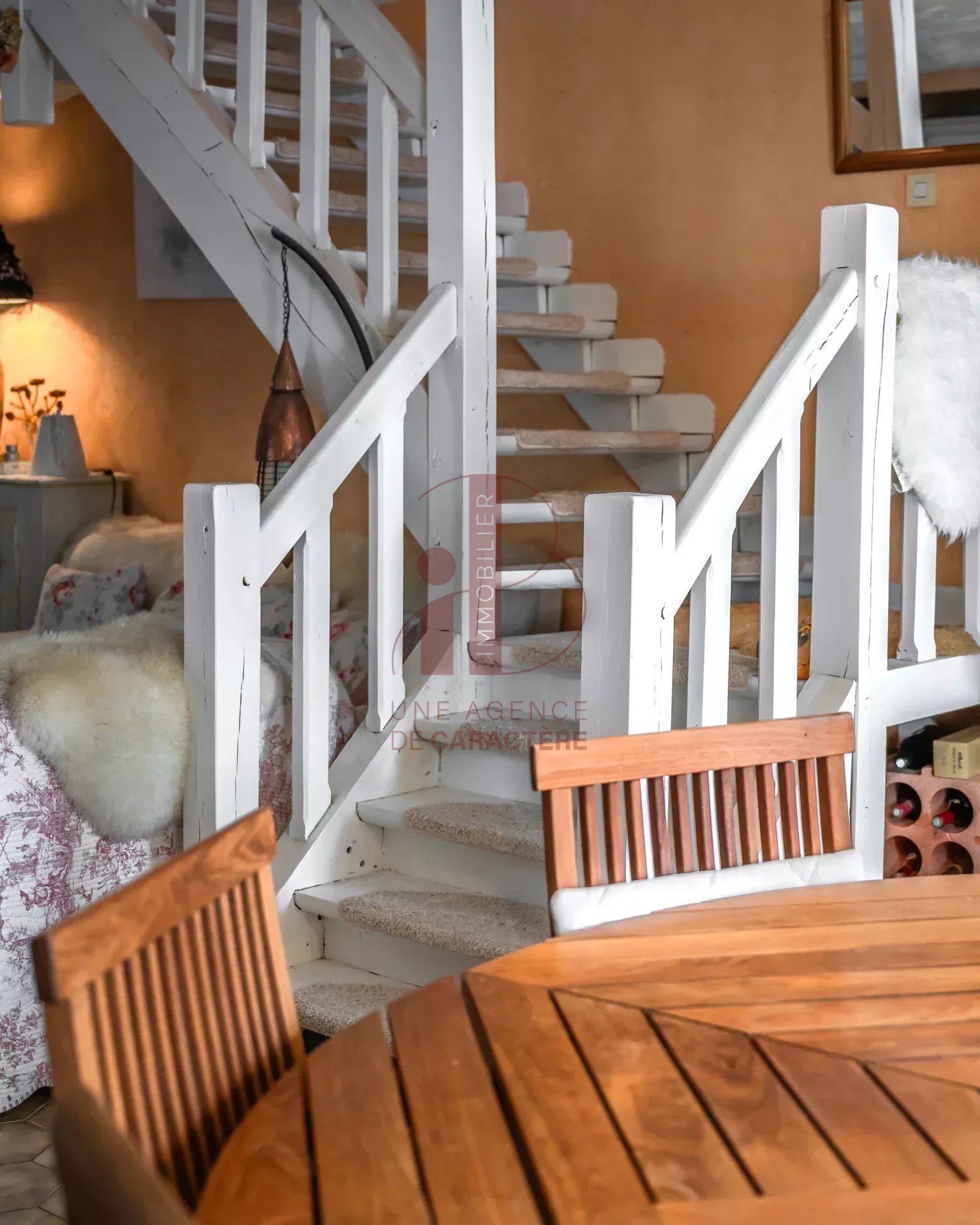 la MAISON D HOTES, de 51m², une CUISINE DINATOIRE avec un poêle à pellets, tres bien équipée, éléctroménager SMEG, par un escalier en bois blanc, accès à UNE GRANDE CHAMBRE CATHEDRALE DE 31M² avec espace salon, salle de bains ouverte et toilettes séparés. Cette maison a son entrée indépendante sur rue.