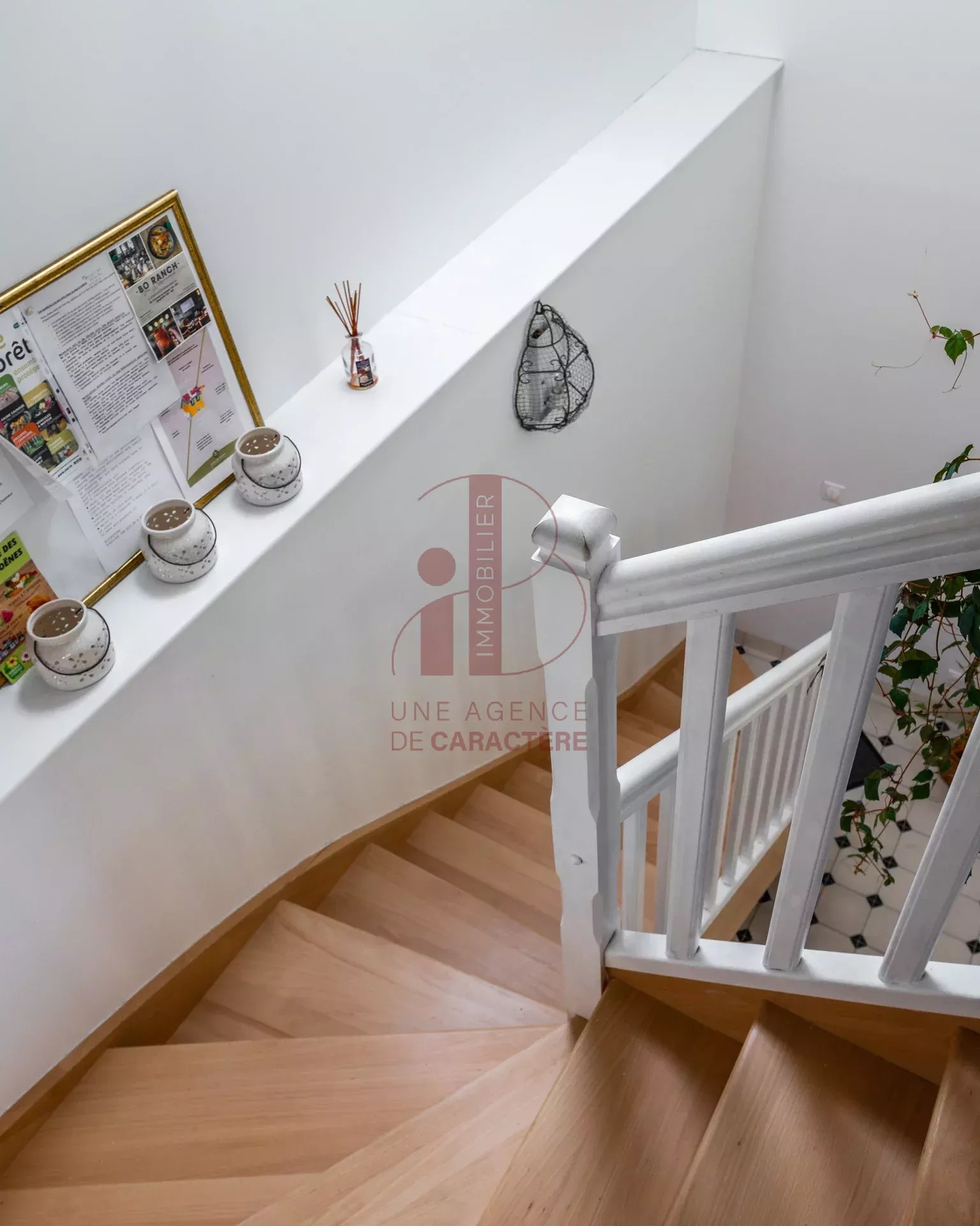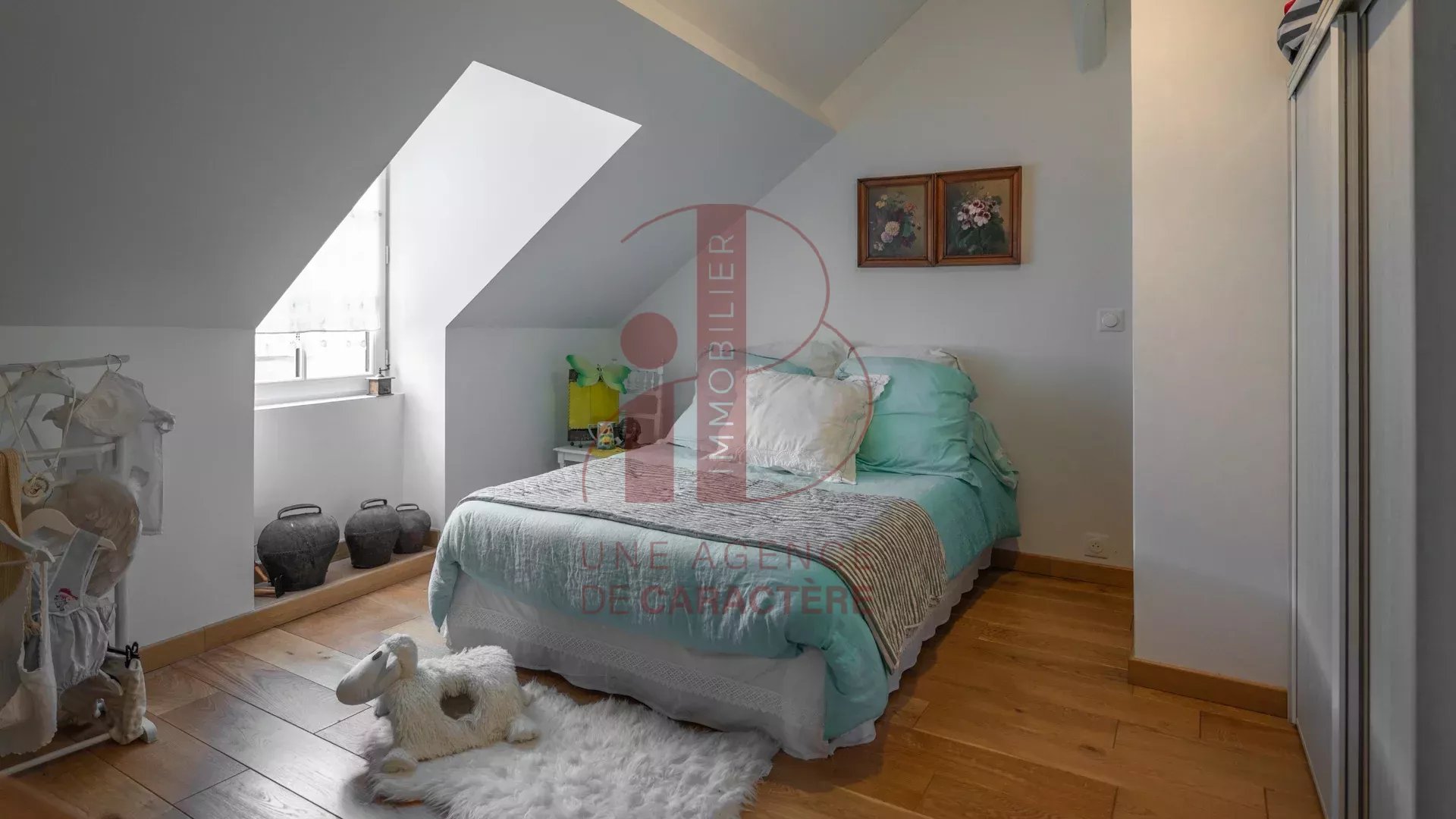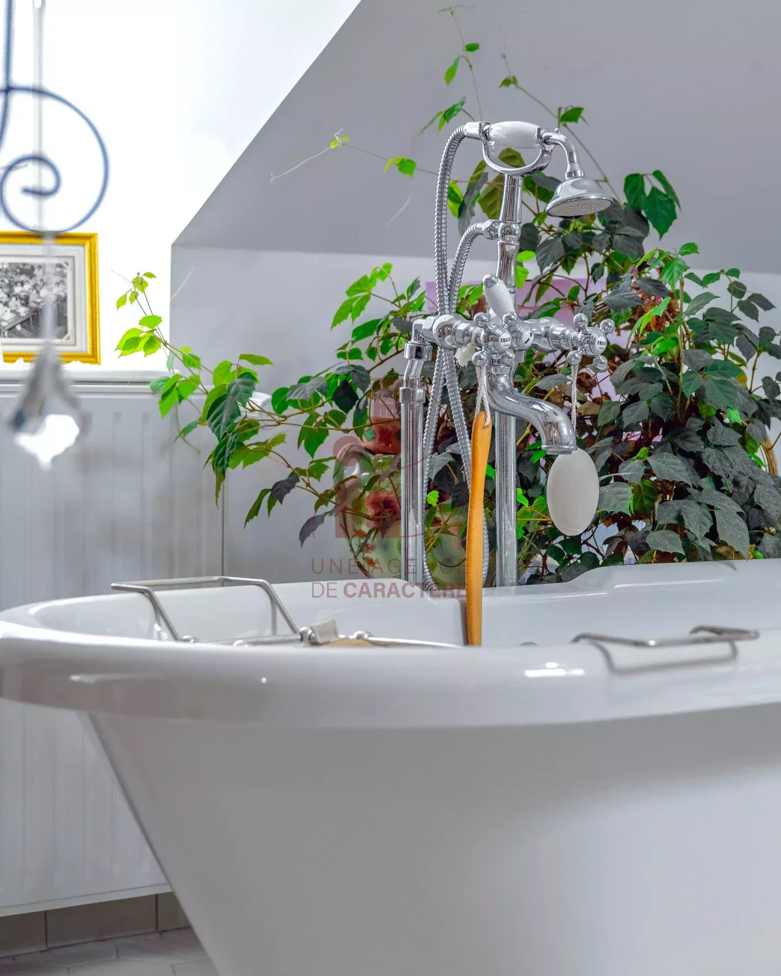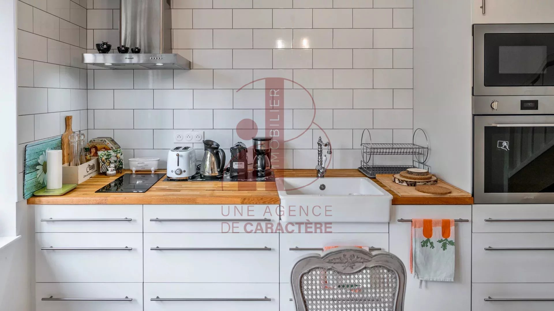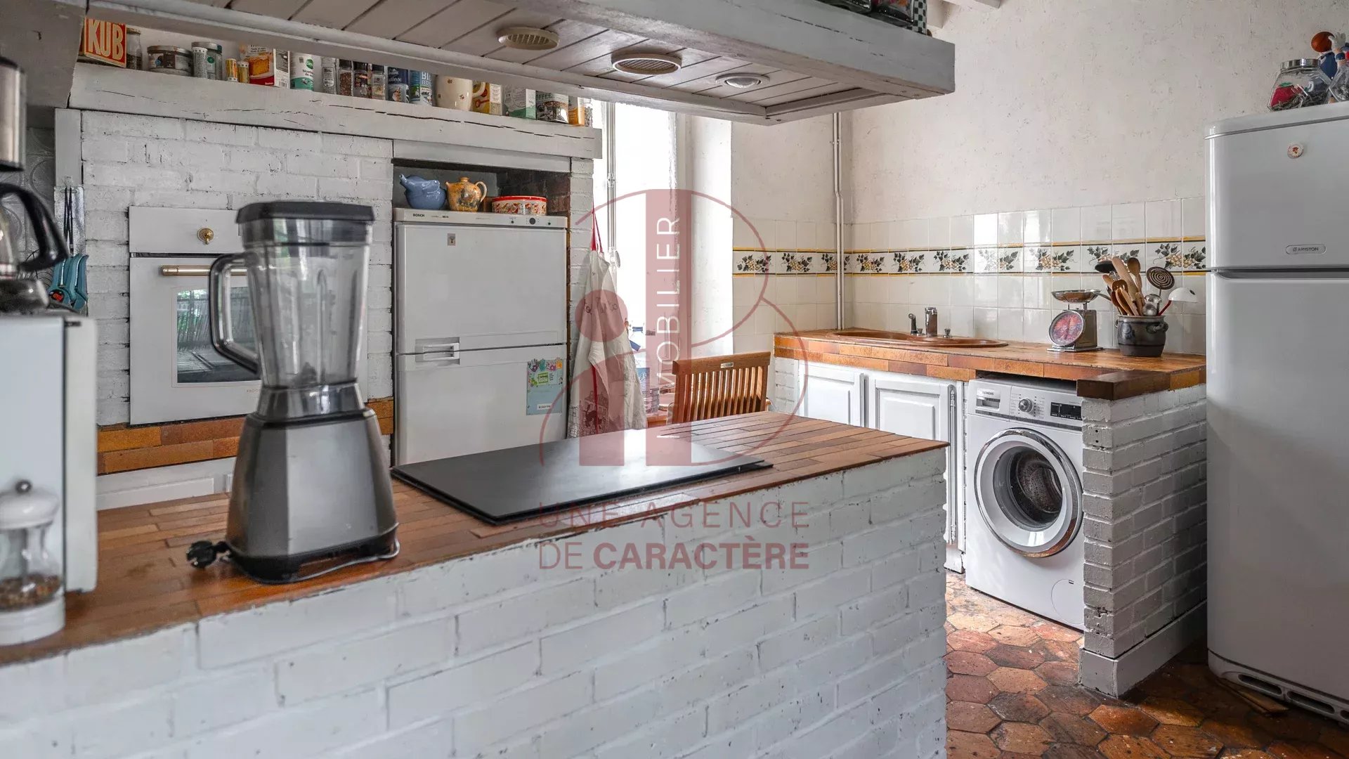 la MAISON D HOTES, de 51m², une CUISINE DINATOIRE avec un poêle à pellets, tres bien équipée, éléctroménager SMEG, par un escalier en bois blanc, accès à UNE GRANDE CHAMBRE CATHEDRALE DE 31M² avec espace salon, salle de bains ouverte et toilettes séparés. Cette maison a son entrée indépendante sur rue.