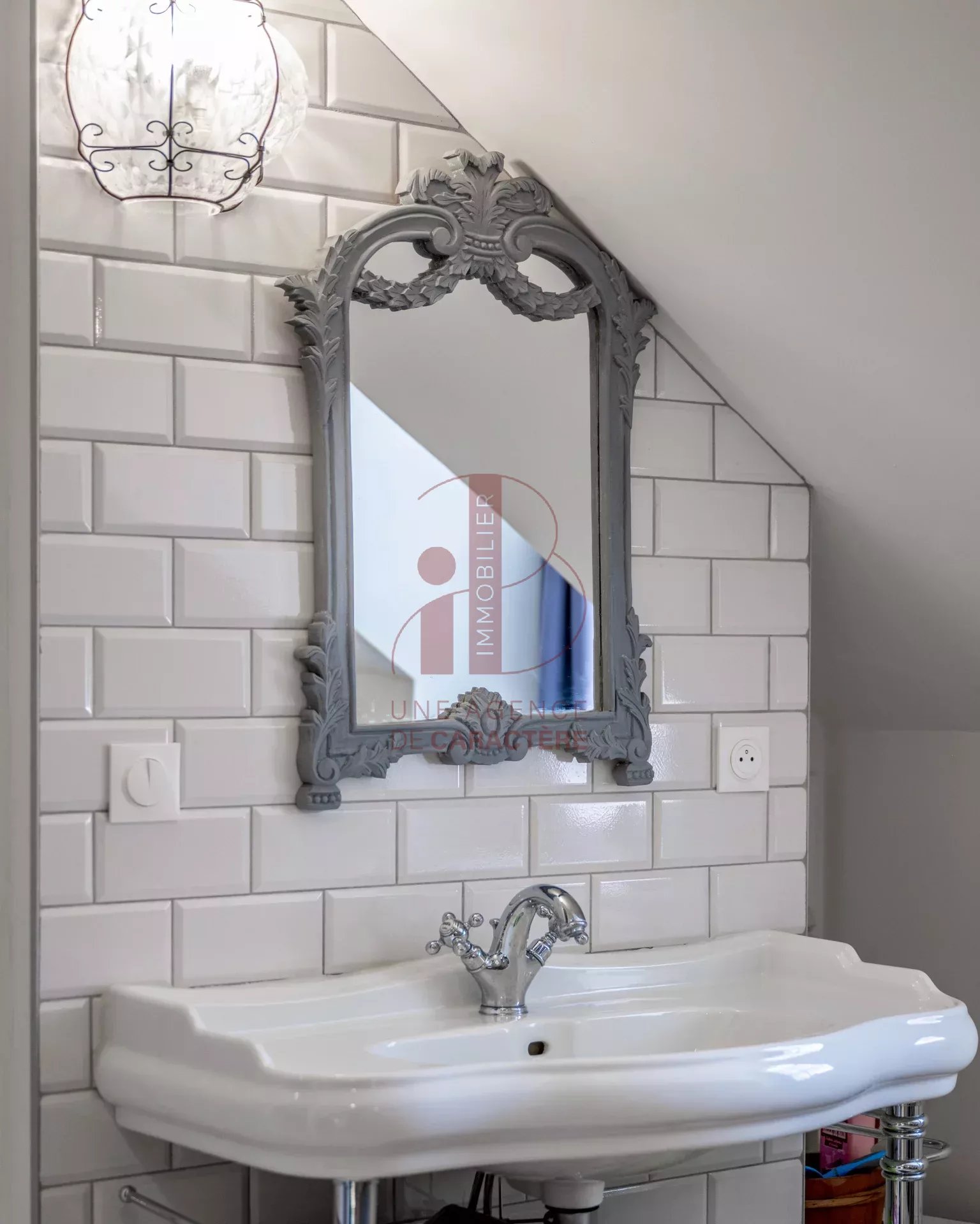 A l'étage, par un escalier en bois blanc, un palier dessert 3 CHAMBRES 19, 14 et 10m² , une SALLE DE BAINS avec toilettes, et UNE GRANDE CHAMBRE CATHEDRALE de 22m² avec une salle de bains ouvrte, baignoire sur pieds et lavabo ancien.