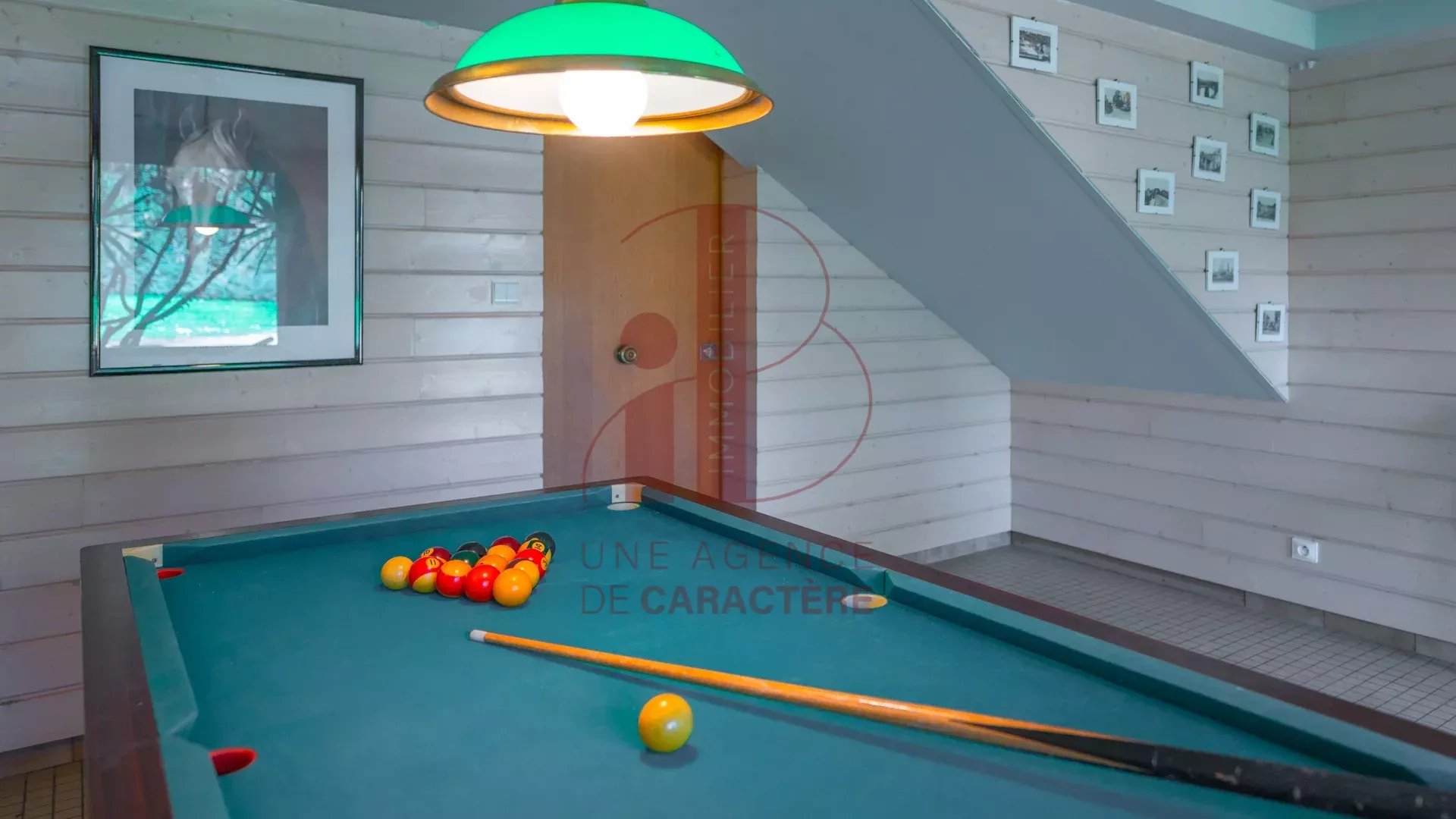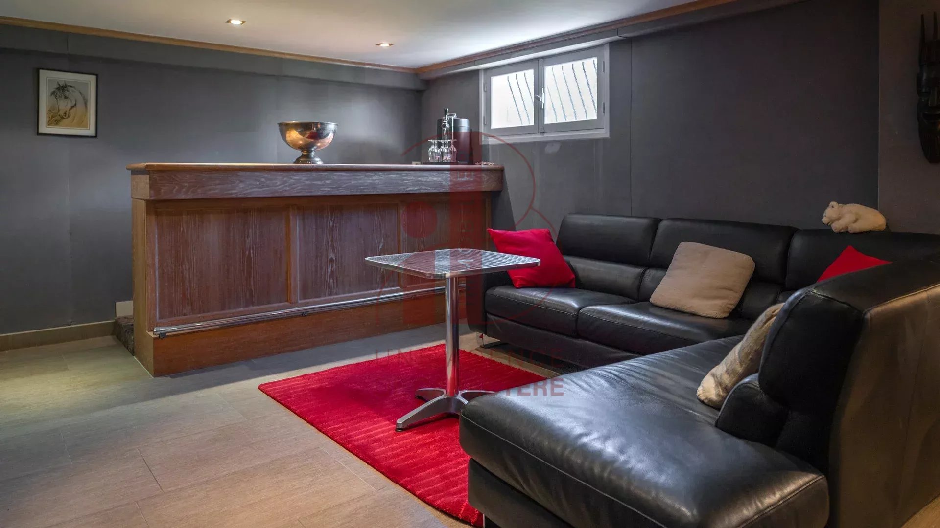 En rez-de-jardin, une entrée, un bureau, une SALLE DE BILLARD, UNE SALLE de PROJECTION, un toilette, une salle d'eau, une pièce à usage de lingerie -chaufferie et un cellier.