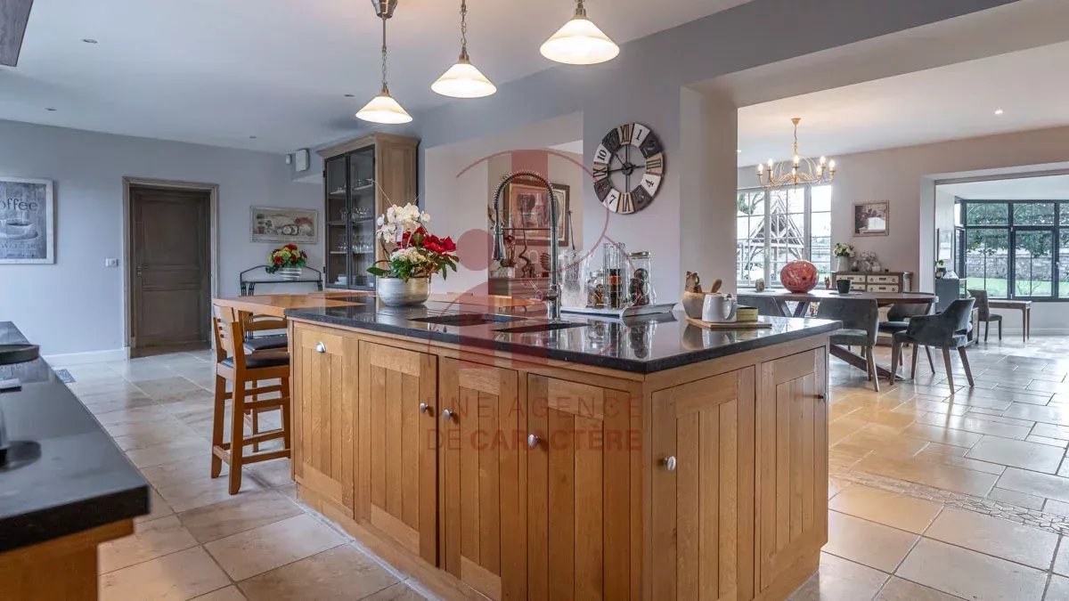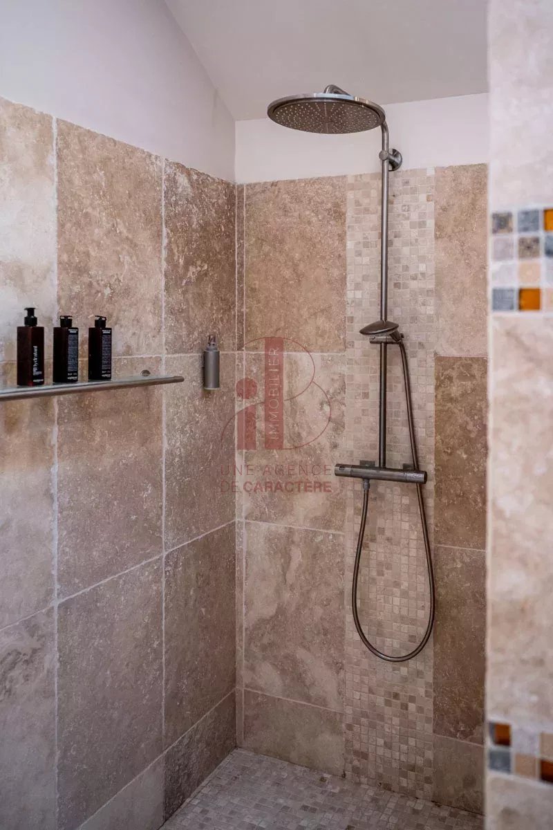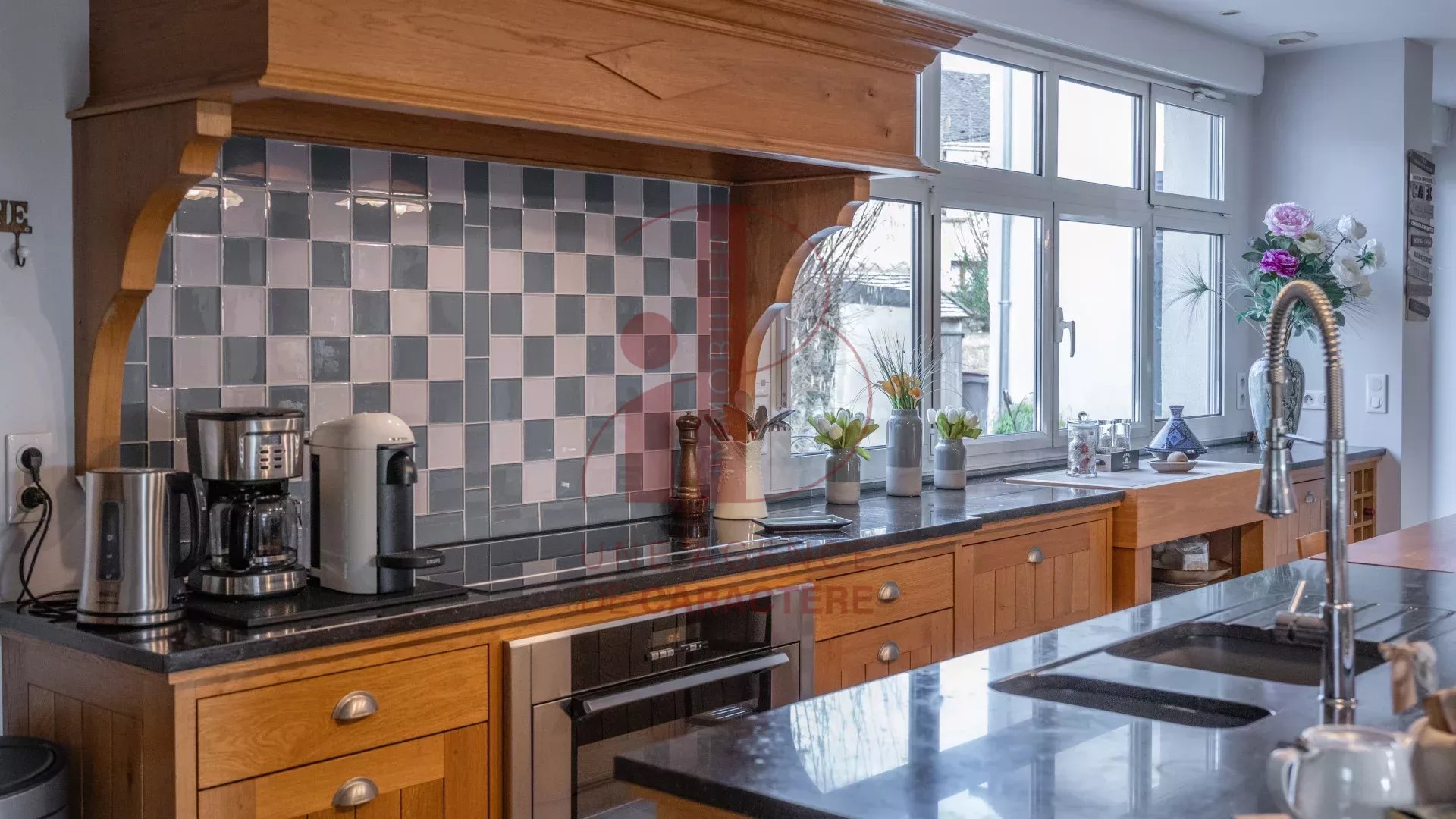 La décoration soignée de cette maison, ainsi que les matériaux naturels tels que la pierre de Jérusalem et le parquet, apportent à l'ensemble un cachet unique. La cuisine dînatoire, avec ses meubles en bois et son plan de travail en marbre noir, est un véritable espace de convivialité.