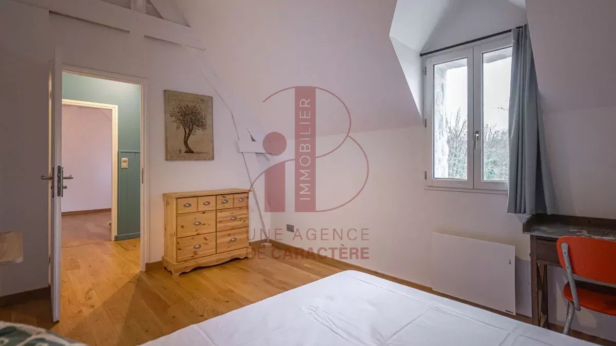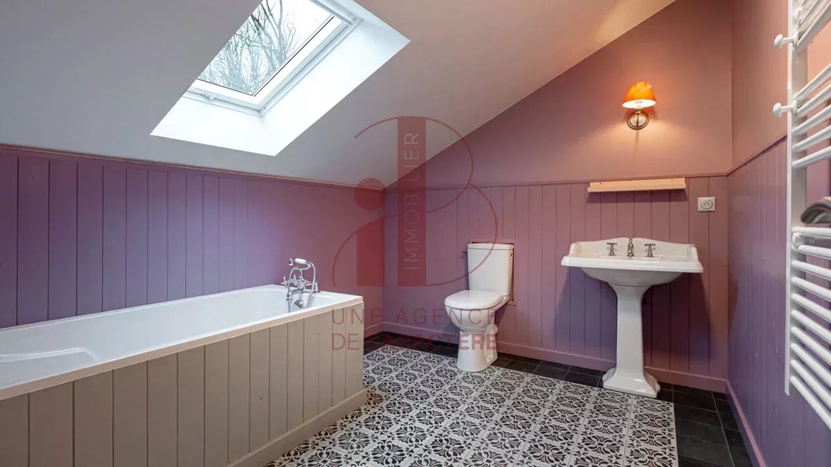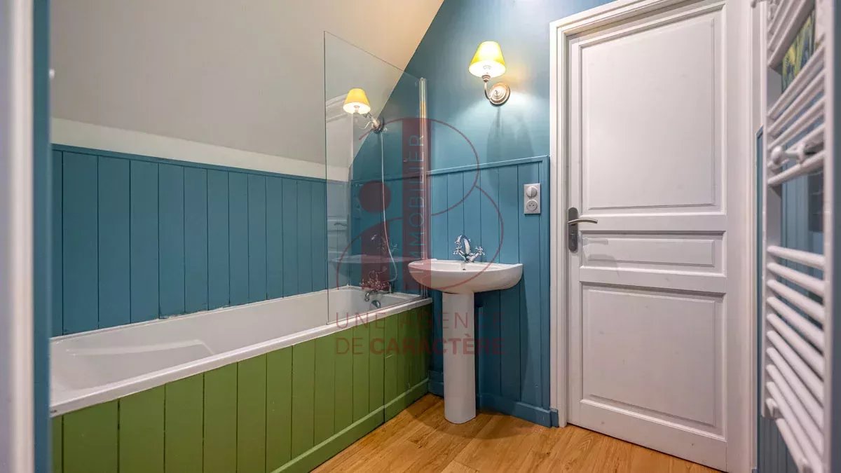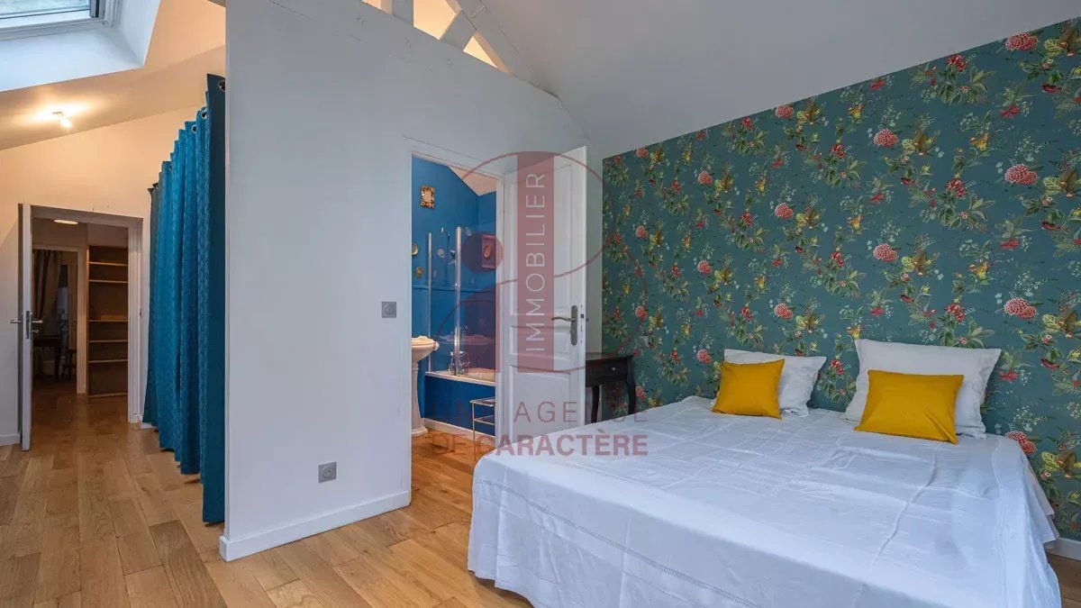 A l'étage, large palier desservant : 3 chambres, 1 salle de bains avec WC, 1 salle de bains partagée pour deux chambres