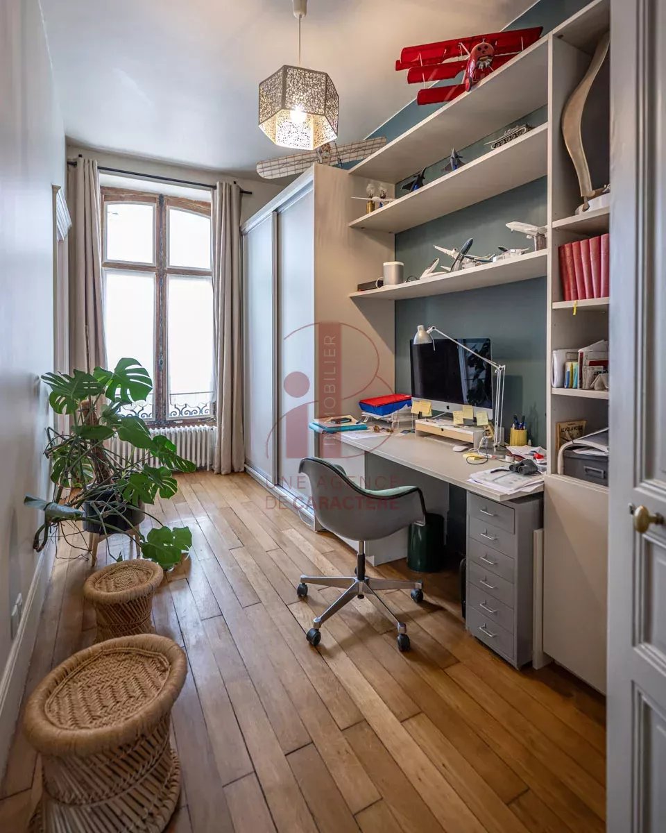 Plus loin, une suite parentale avec salle de bains privative se prolonge par une pièce attenante à usage de dressing et de bureau, accessible depuis la chambre ou le couloir. Ce dernier mène également aux toilettes, ainsi qu'à un dégagement donnant accès à un escalier en bois desservant l'étage.
