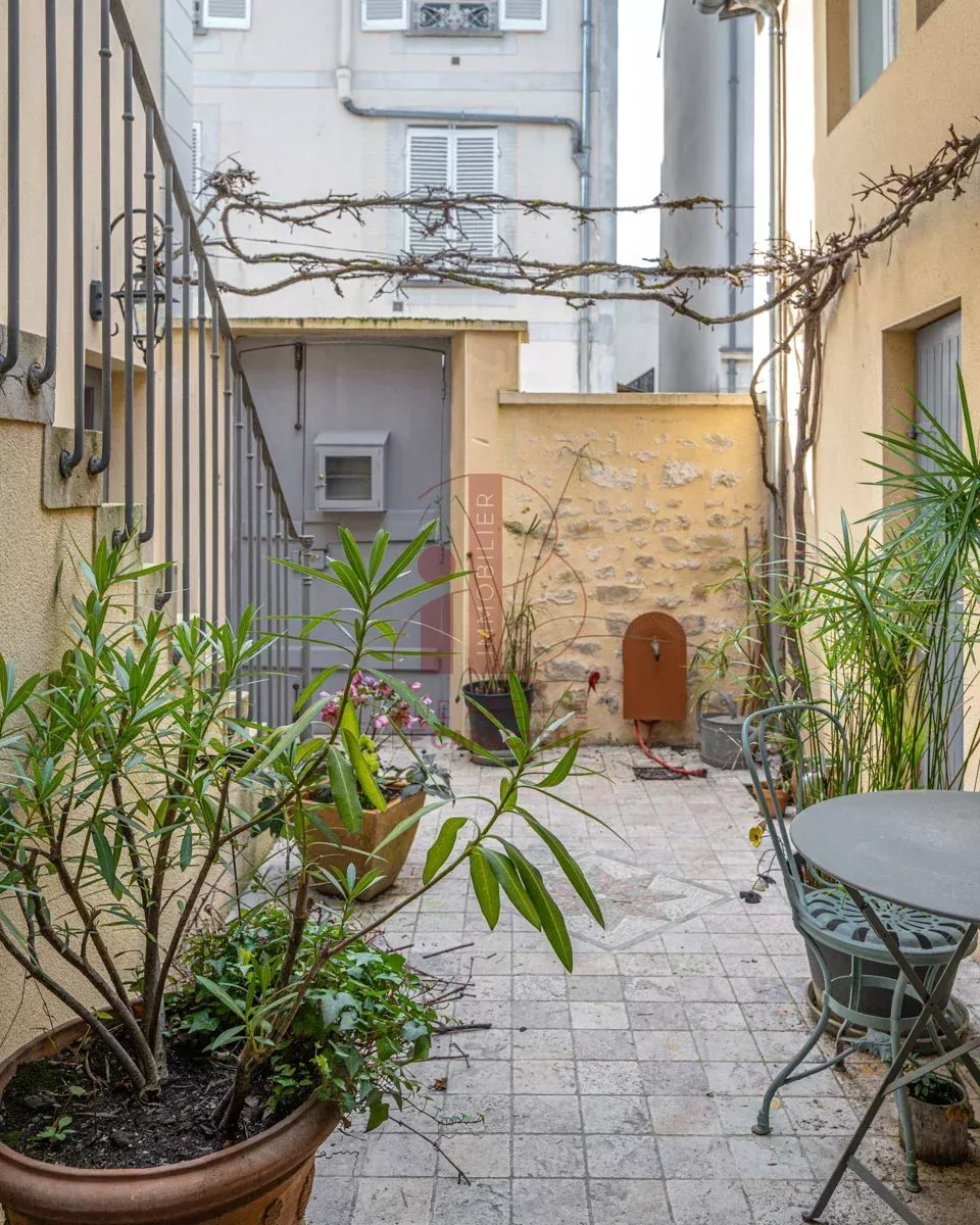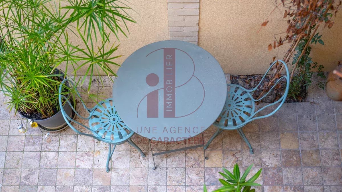 À L'EXTERIEUR : Un jardin de 460 m² (surface cadastrale) se divise en deux espaces distincts. D'un côté, une cour close de murs, en partie végétalisée, agrémentée d'une terrasse semi-ouverte. De l'autre, un jardin en angle, orné de rosiers, où un platane fait office de parasol pour les déjeuners en extérieur durant l'été.