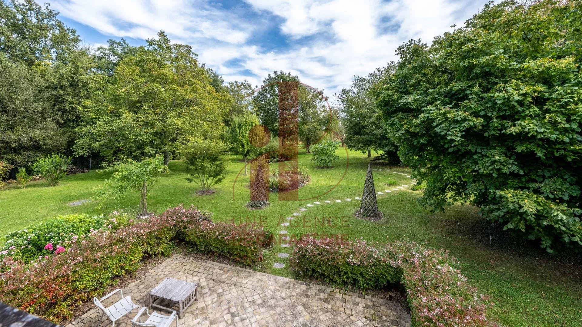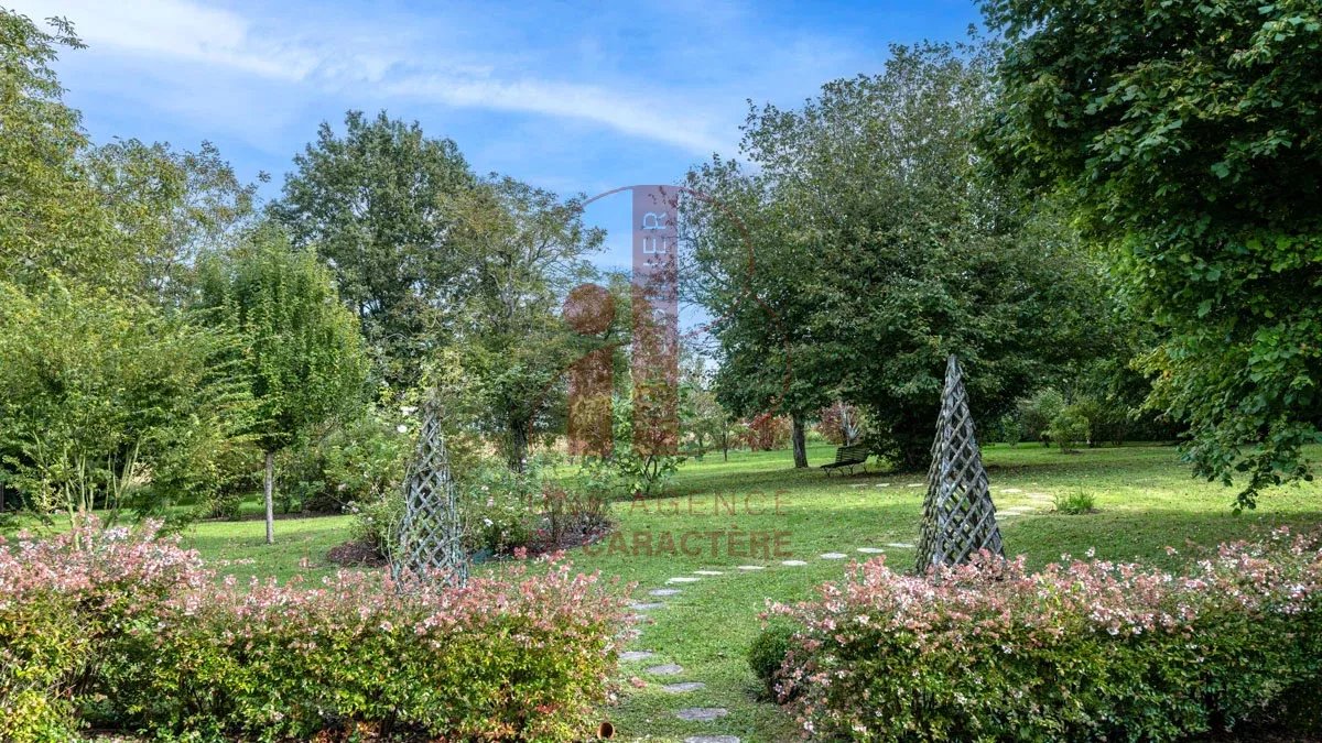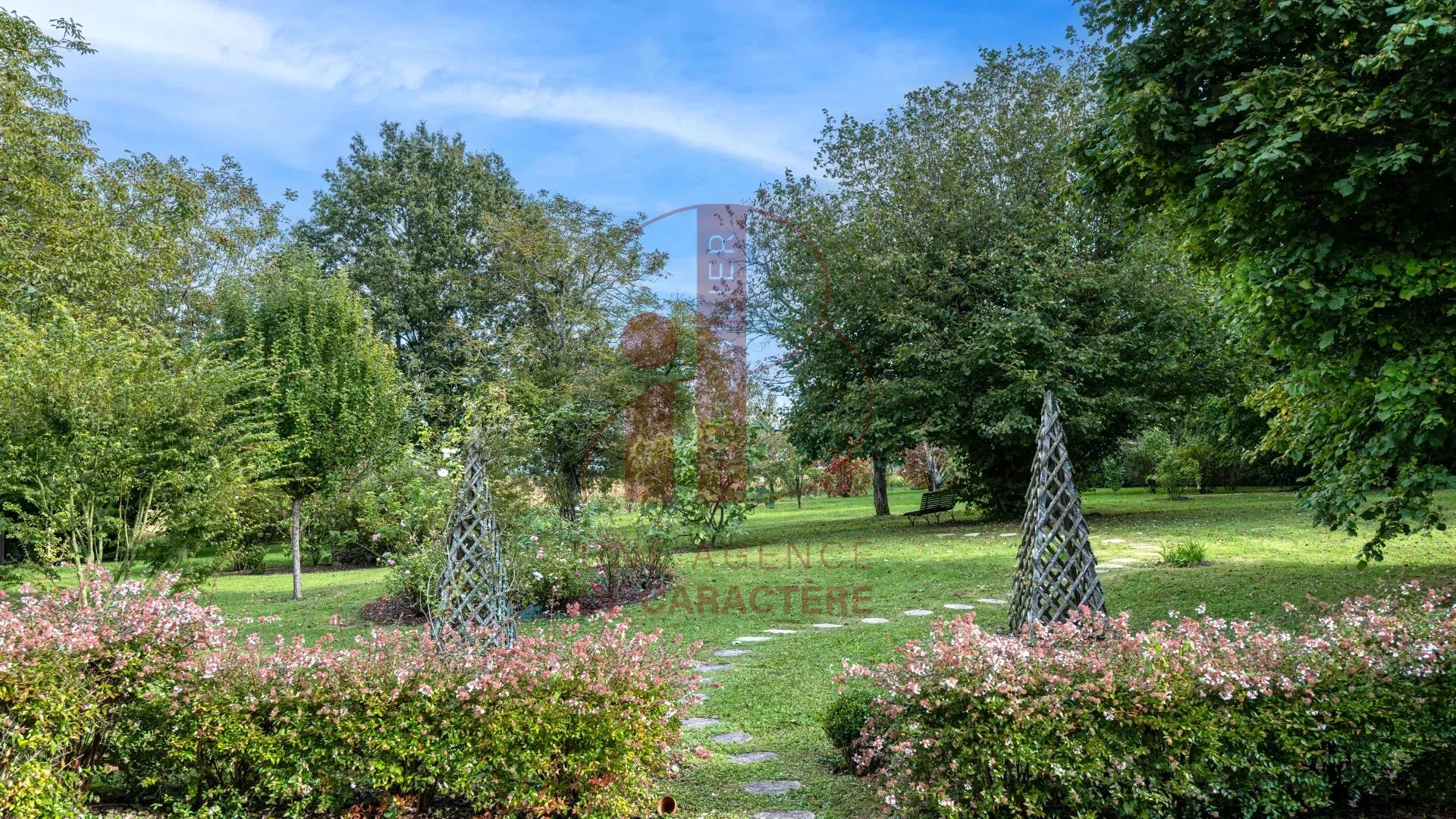 A l'extérieur, un MAGNIFIQUE JARDIN PAYSAGER, une roseraie comprenant des roses Pierre de Ronsard, Ghislaine de Feligonde et d'autres variétés choisies avec attention, un cerisier d'ornement, un figuier, de nombreux arbres de collection notamment un beau Gingko Biloba. Le jardin se prolonge sur la campagne environnante, sans vis à vis.