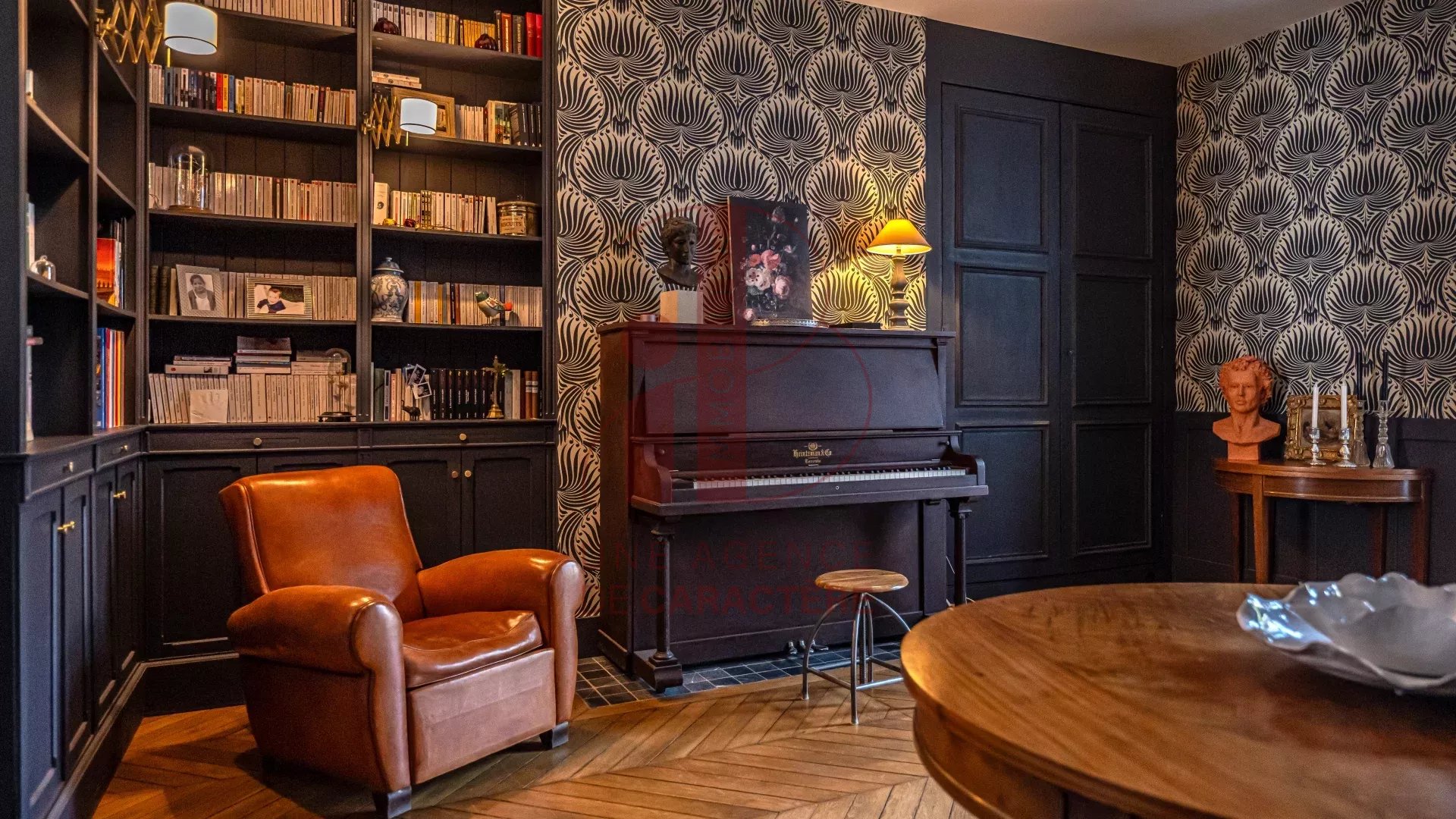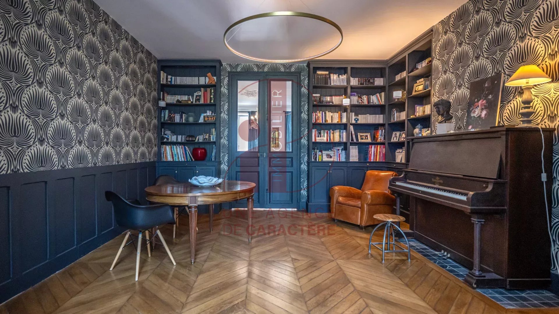 Au rez-de-chaussée, une entrée, un DOUBLE - SALON de 55 m² composé d'un salon de réception et d'un salon de musique avec bibliothèque, une cuisine dinatoire équipée d'un piano FALCON, lumineuse avec son toit verrière, bénéficiant d'un accès à la terrasse et au jardin.