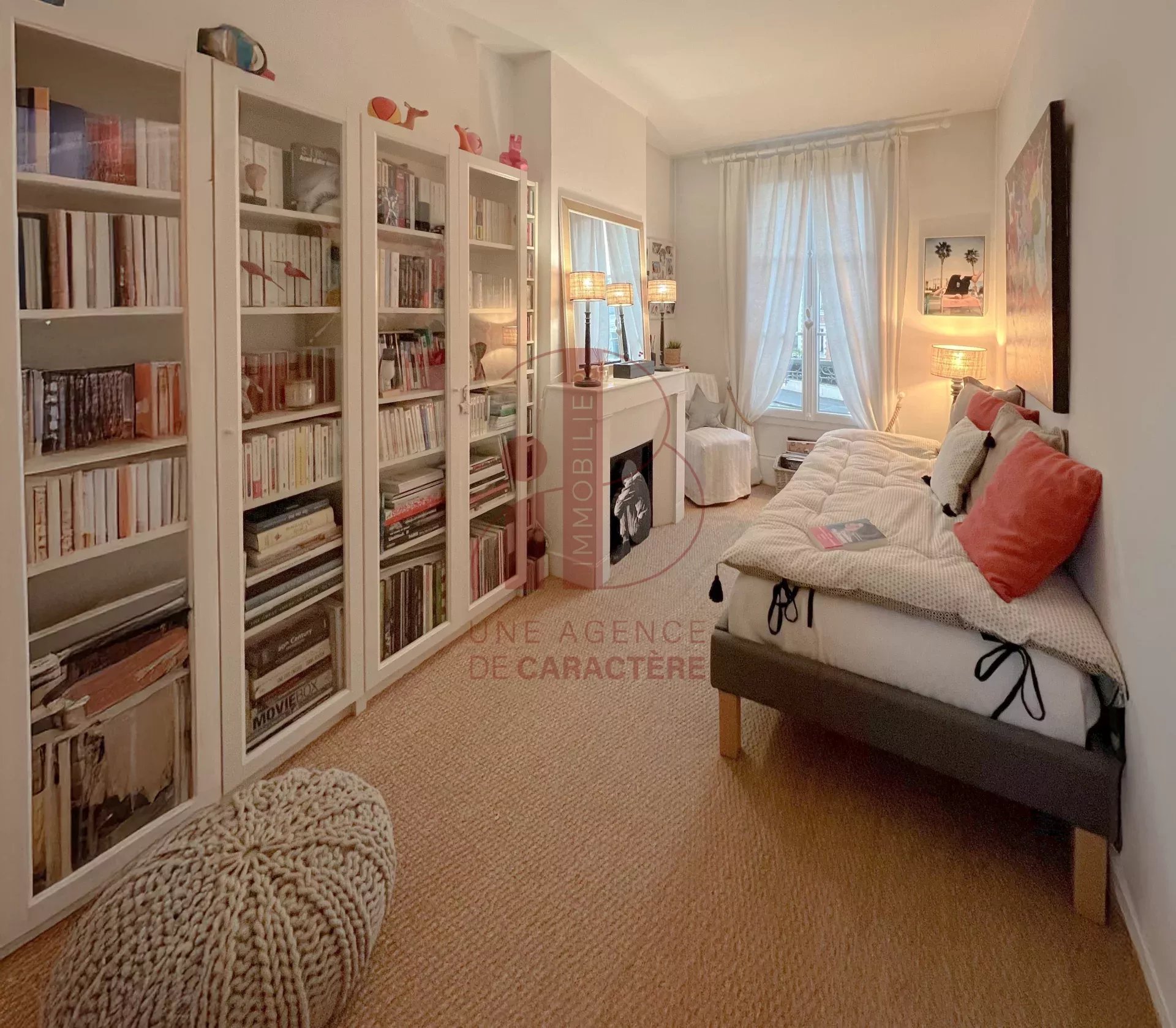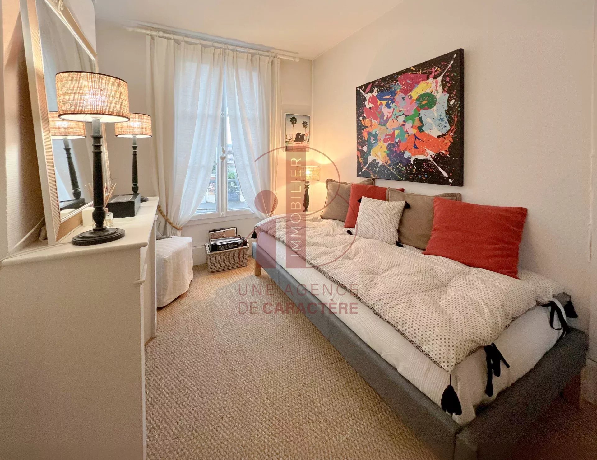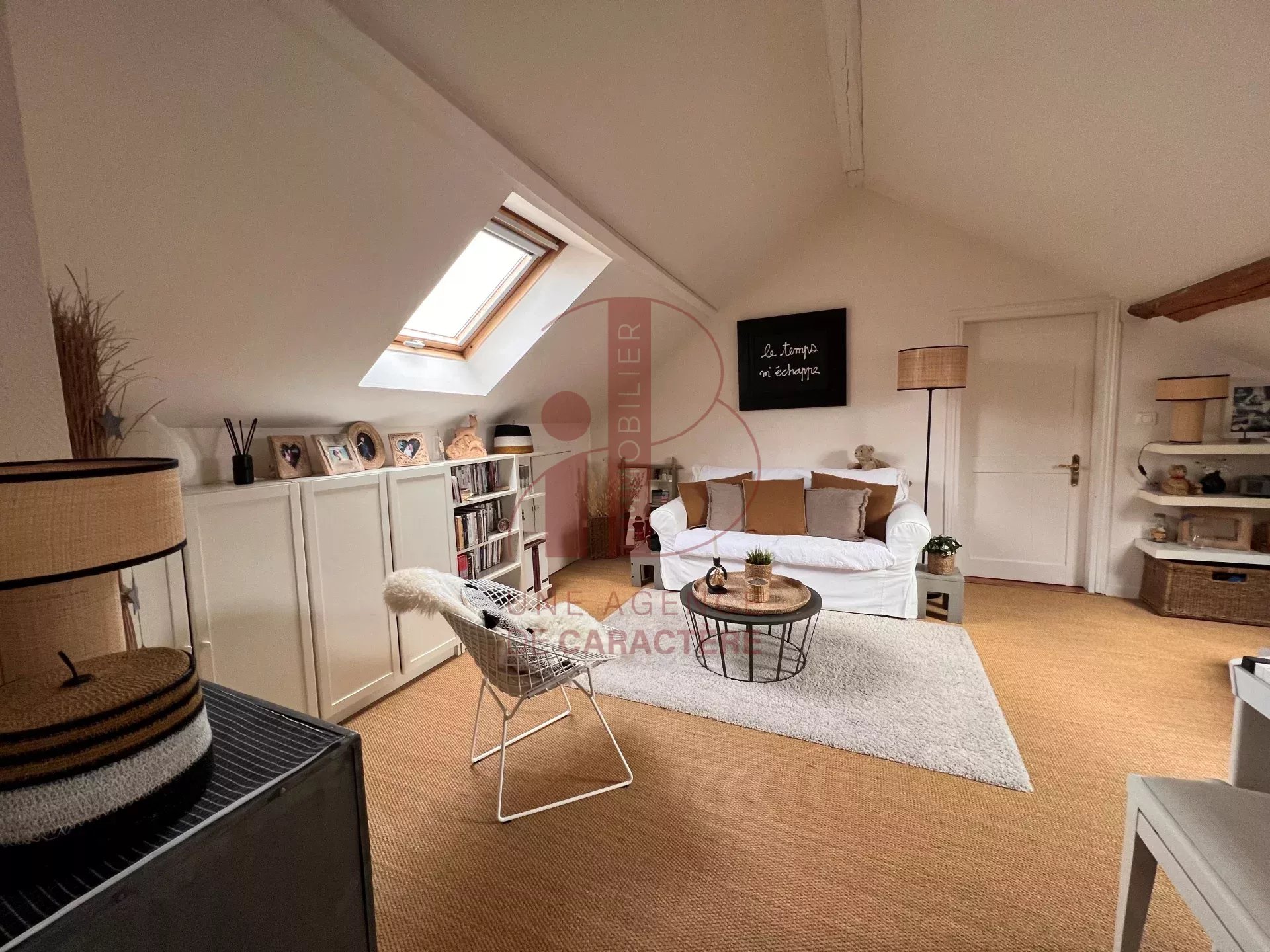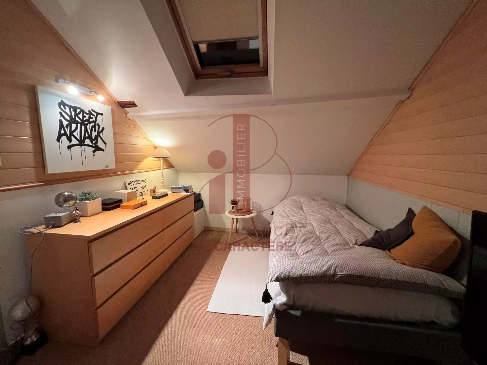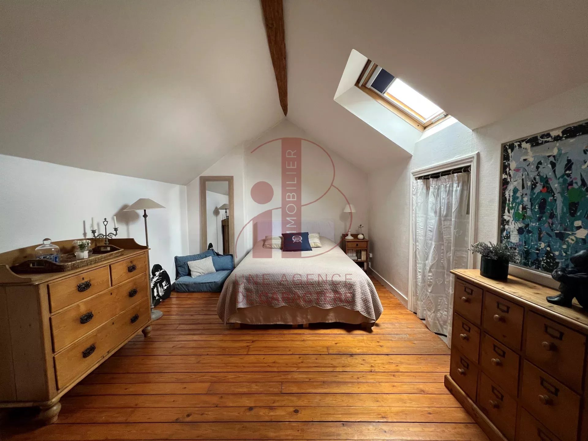 Au deuxième étage légèrement mansardé, une pièce à usage de SALON avec jonc de mer au sol dessert une GRANDE CHAMBRE avec cabinet de toilette et un dressing, et une CHAMBRE.