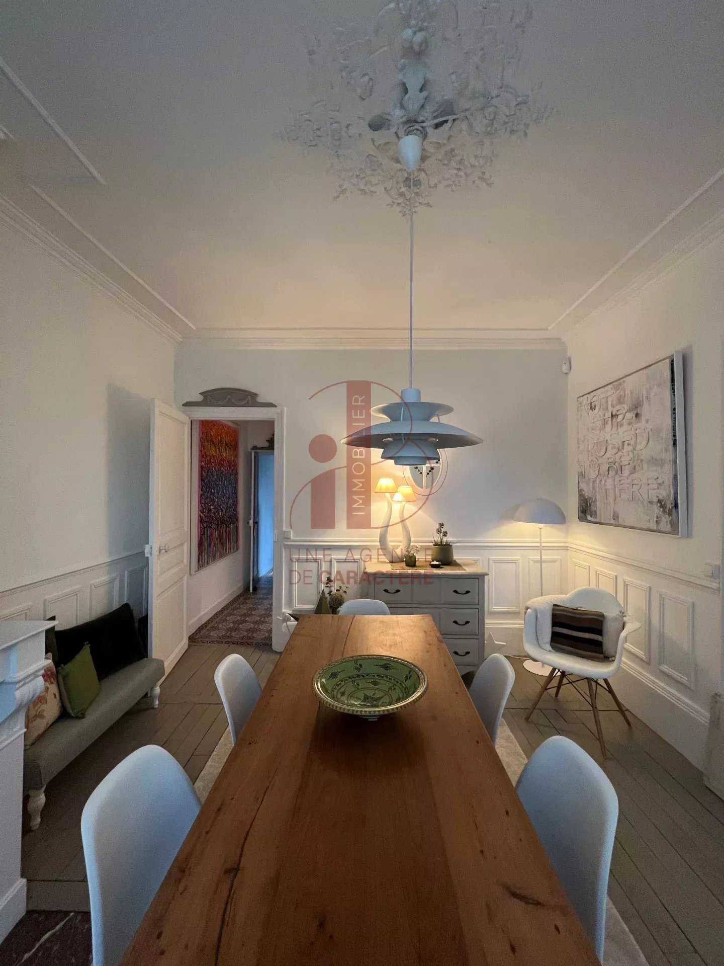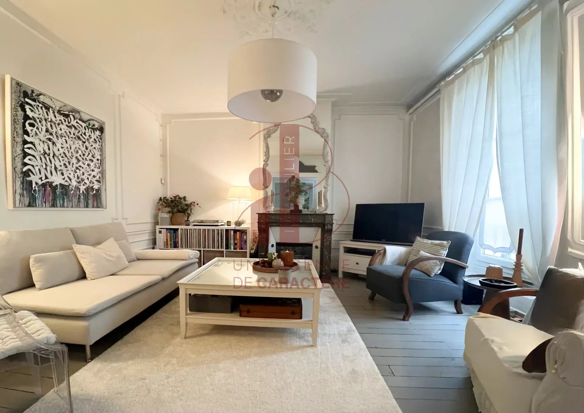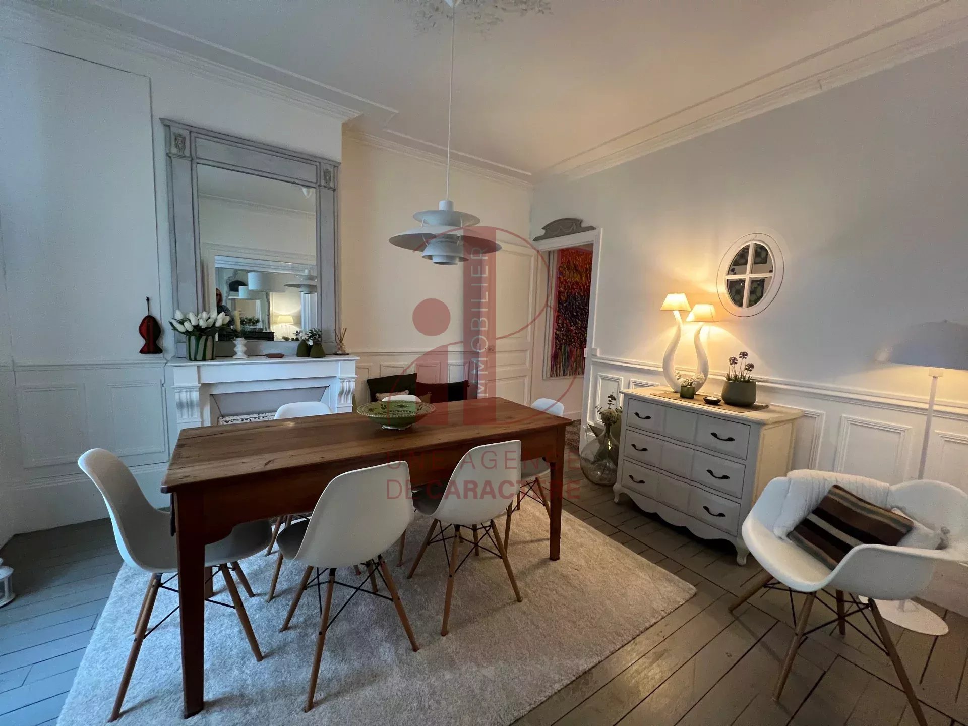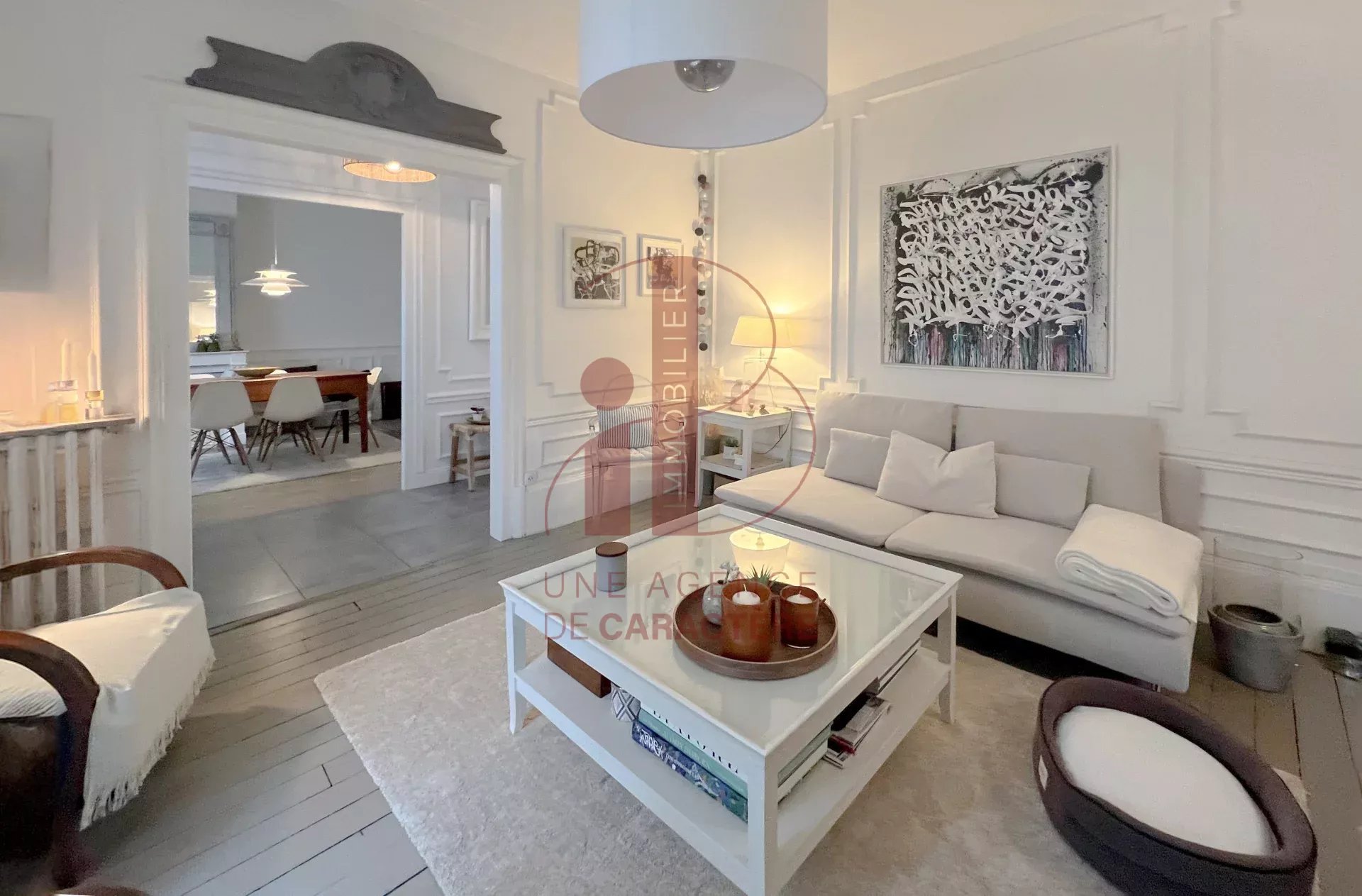 Moulures au plafond, rosace, parquet, cheminées lasurées blanc apportent une NOTE CONTEMPORAINE et CLARTE.