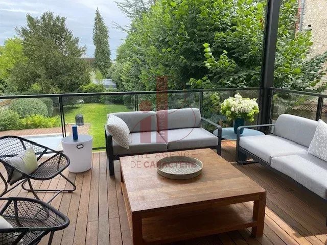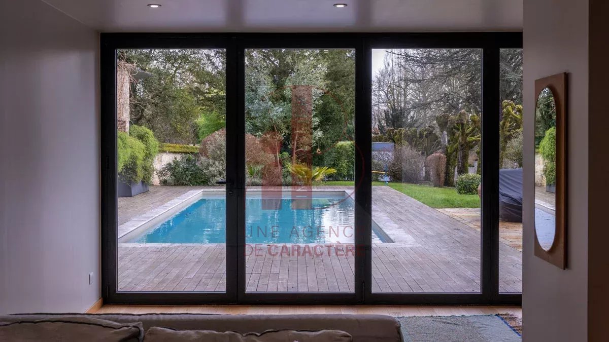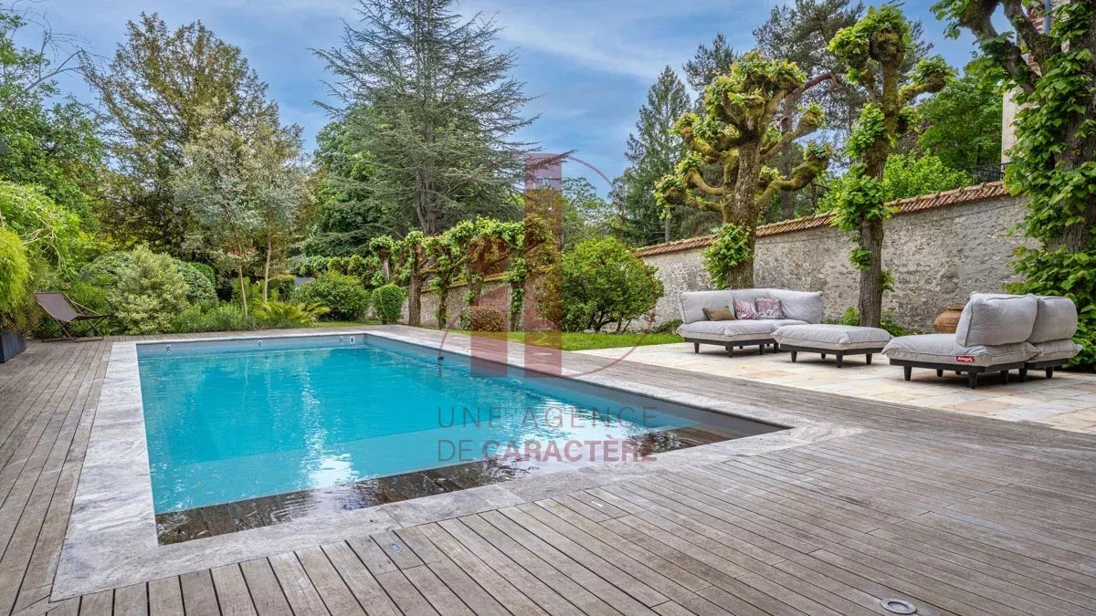 Cette PROPRIETE BOURGEOISE fin XIXème de 313 M² se situe en retrait de rue, elle se développe sur QUATRE NIVEAUX avec au REZ-DE-CHAUSSEE un espace ENTREE avec vestiaire s''ouvre sur un VASTE SALON en L avec une SALLE A MANGER (57m²), s'ouvrant sur une GRANDE TERRASSE abritée surplombant la piscine. Cette terrasse est des plus agréables dès les beaux jours avec son salon et son espace repas où il fait bon se poser.