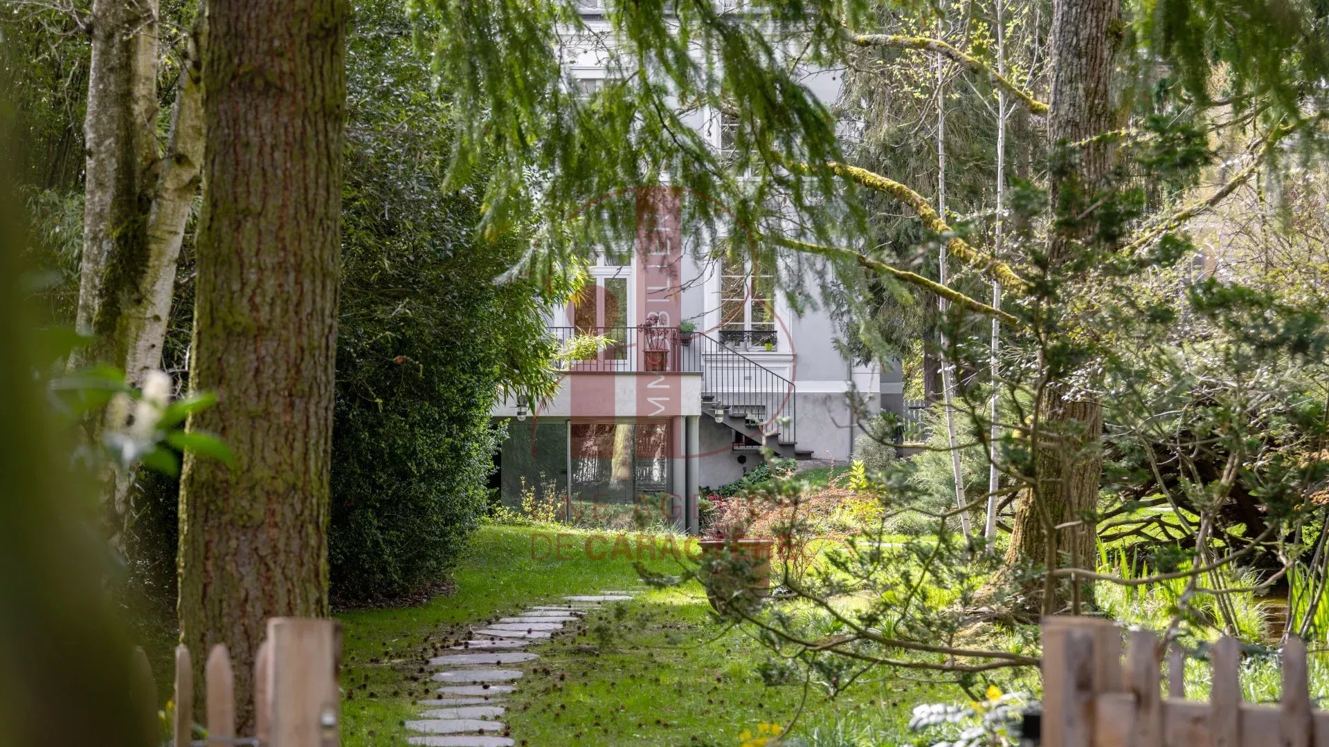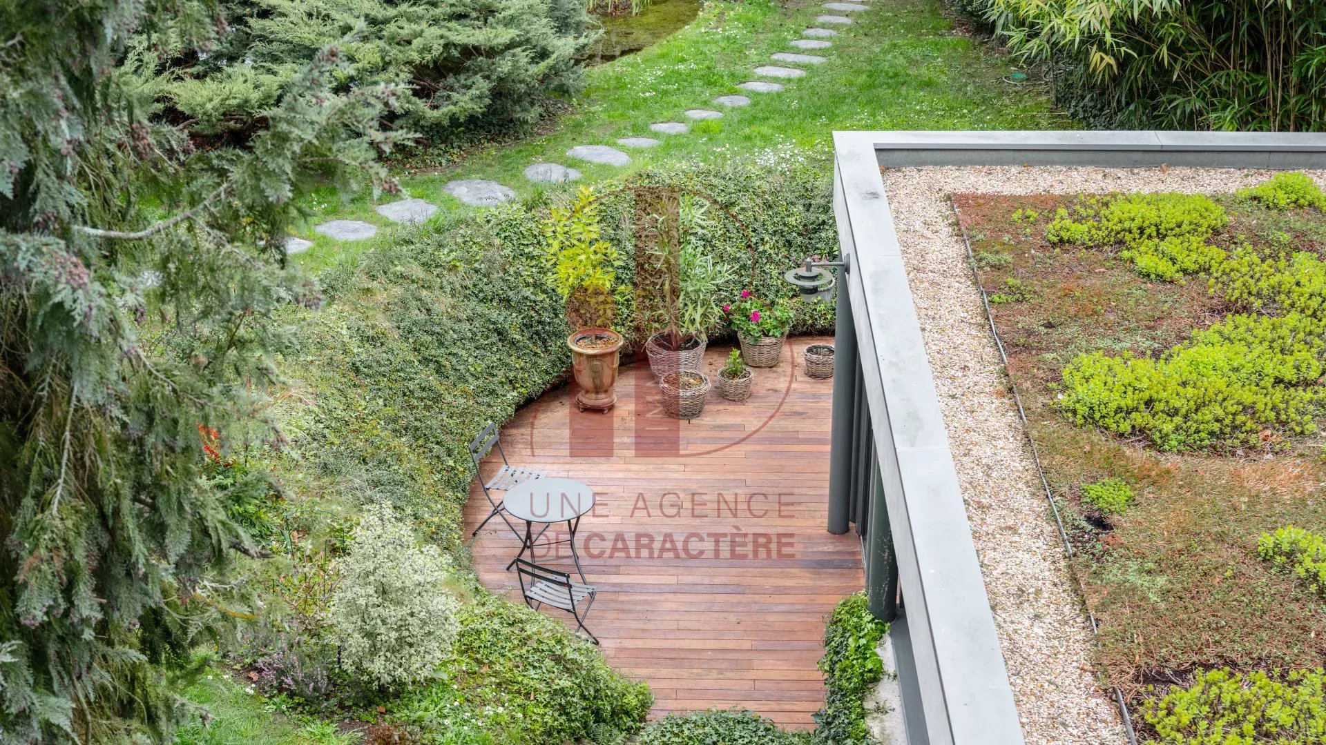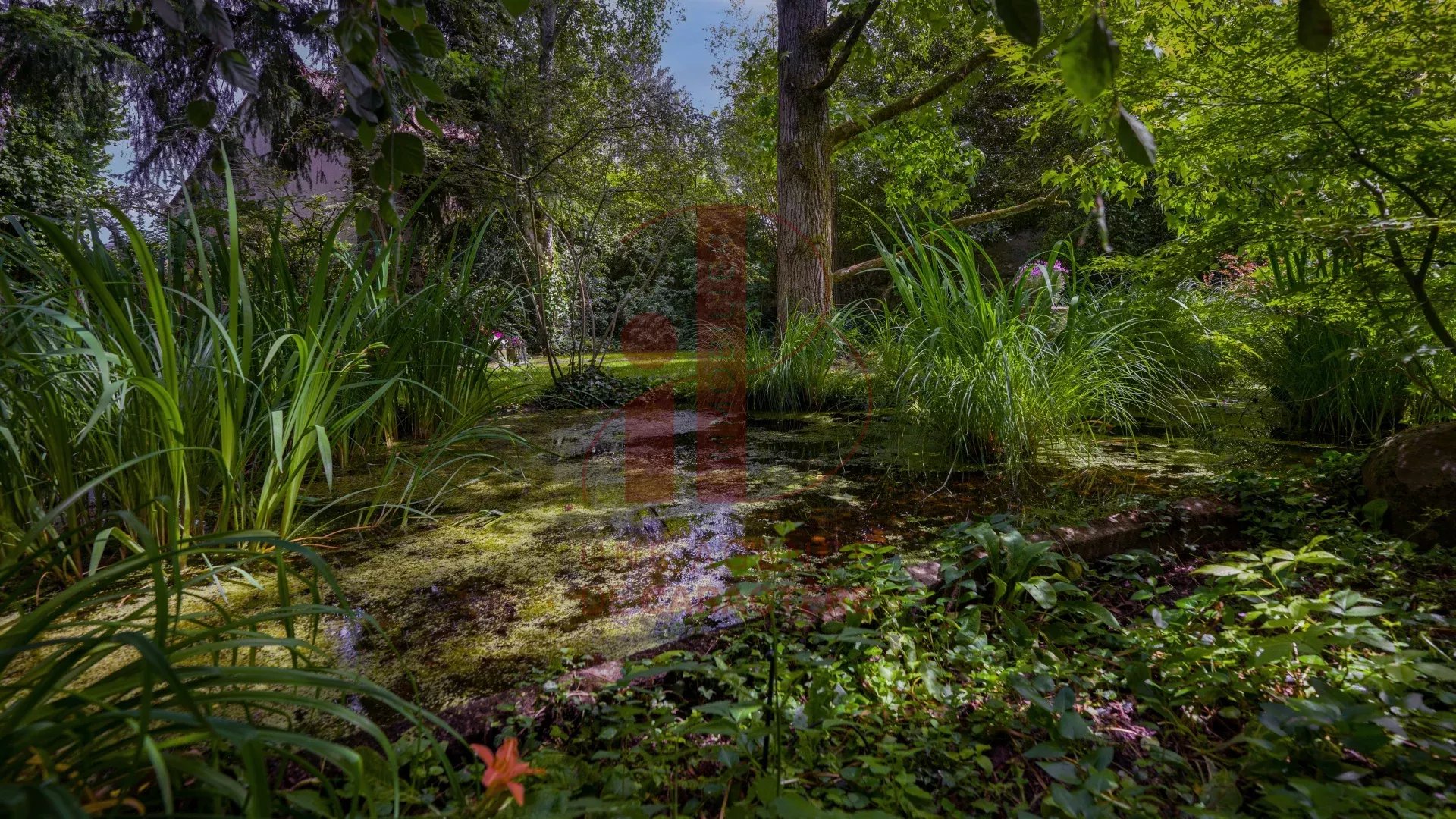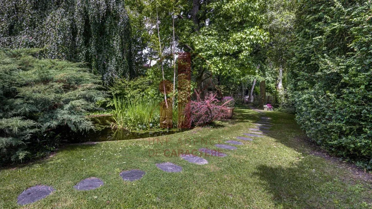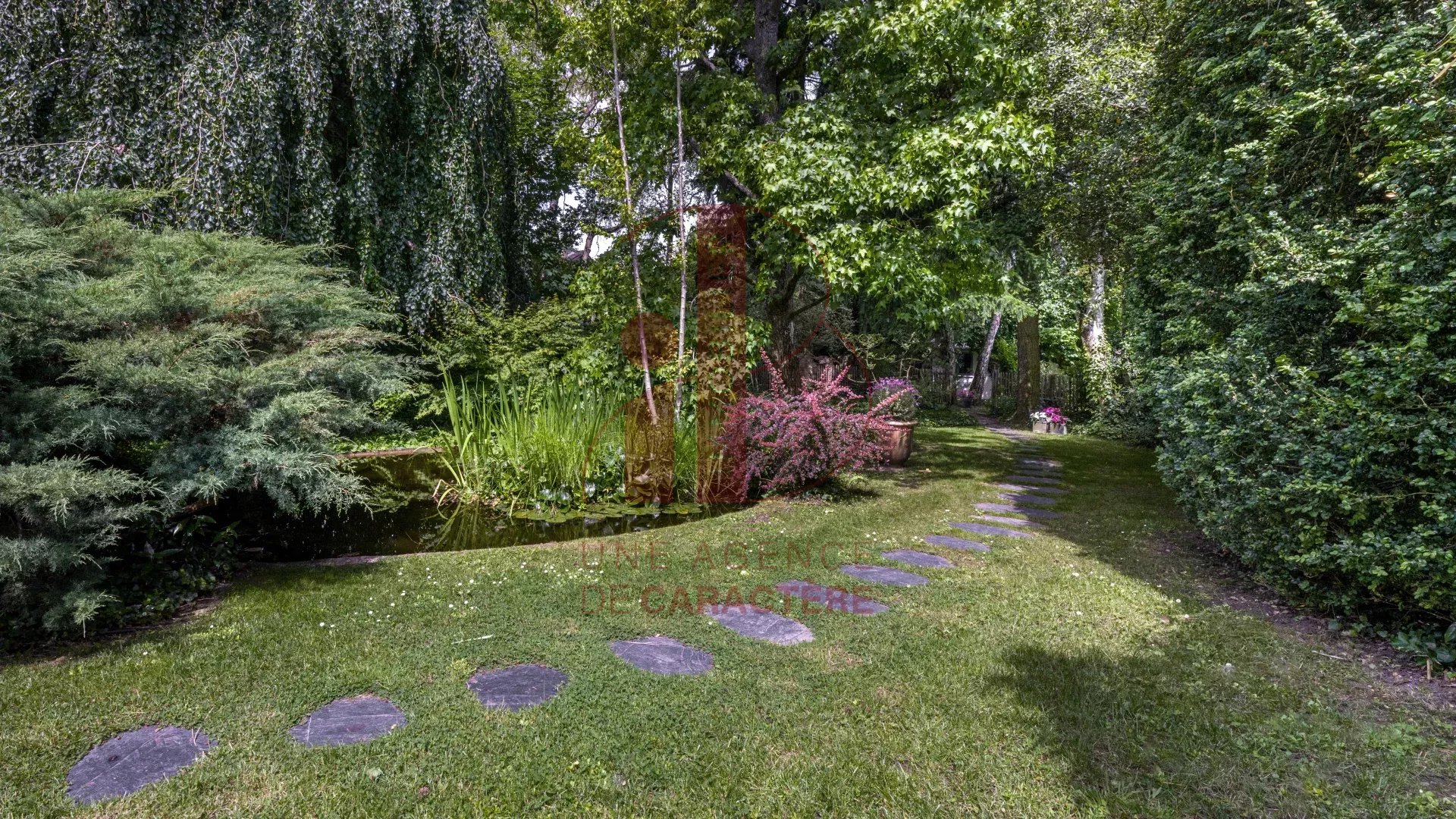 A l'arrière, un JARDIN EXCEPTIONNEL de 1.650m² offrant différentes atmosphères, une pièce d'eau entourée de végétation verdoyante, le liquidambar au feuillage mordoré, un hêtre pleureur, les douglas, les différents bouleaux, le cornouillé et les haies composées de différentes essences d'azalées, de rhododrindrons apportent de belles couleurs en toute saison et invitent à la détente et au dépaysement.