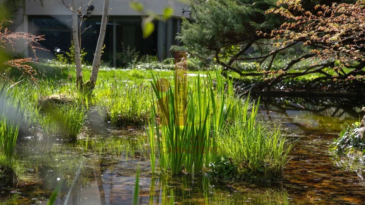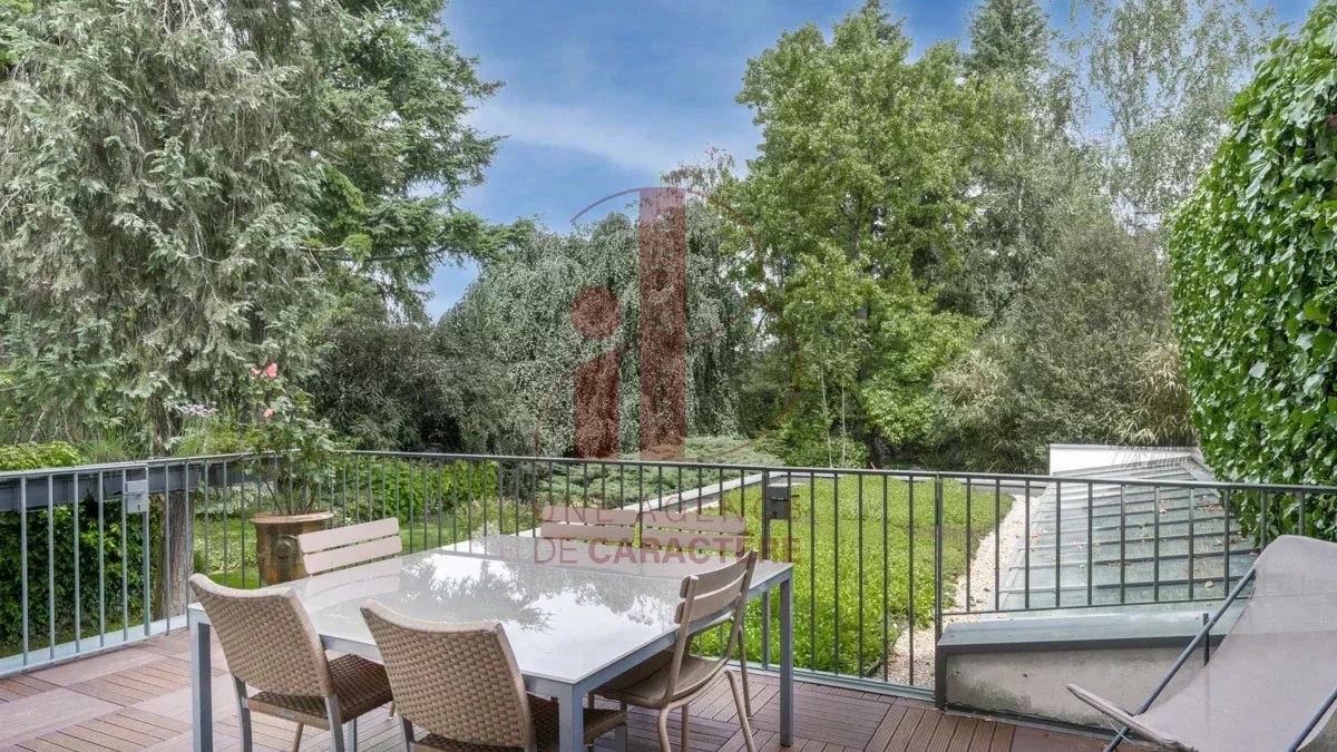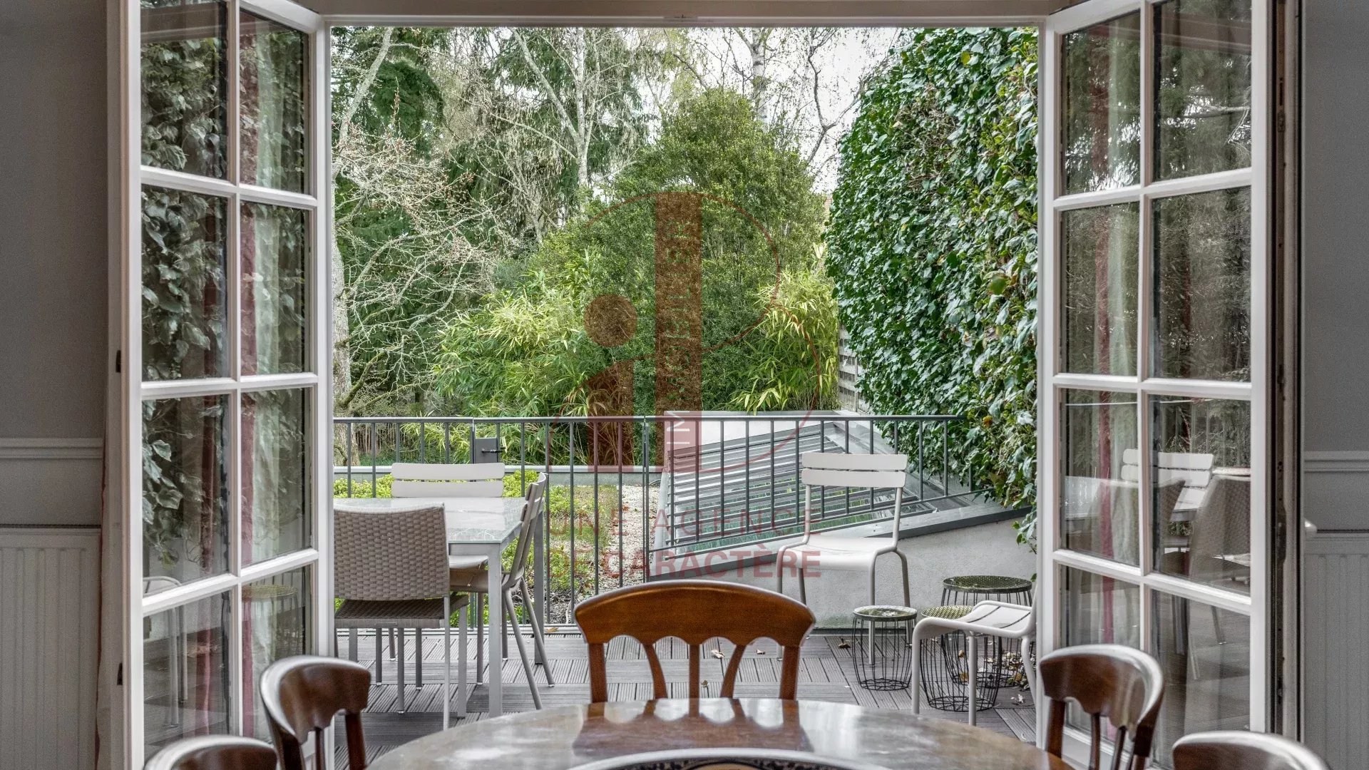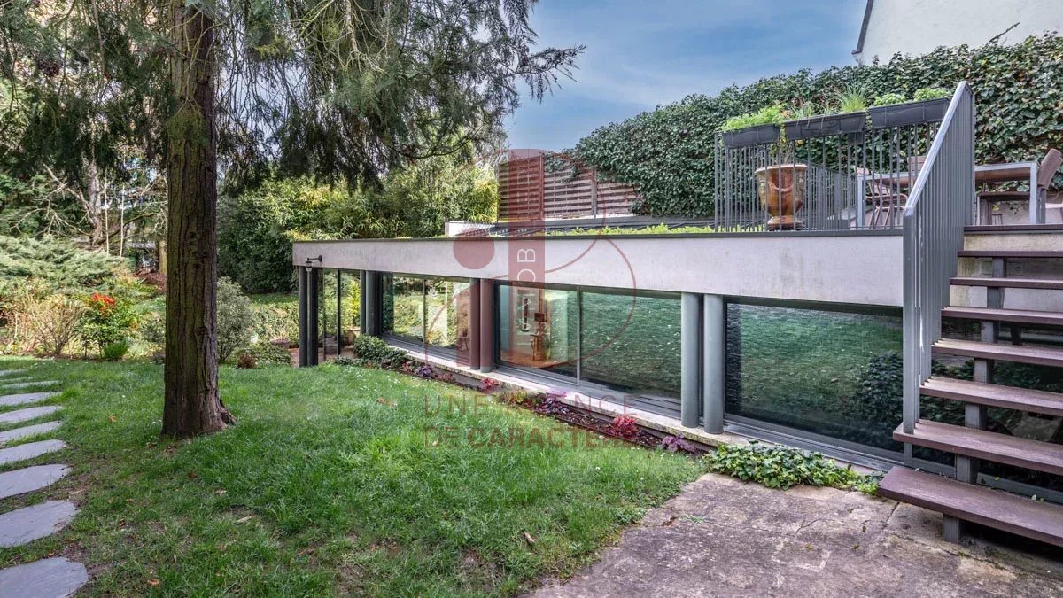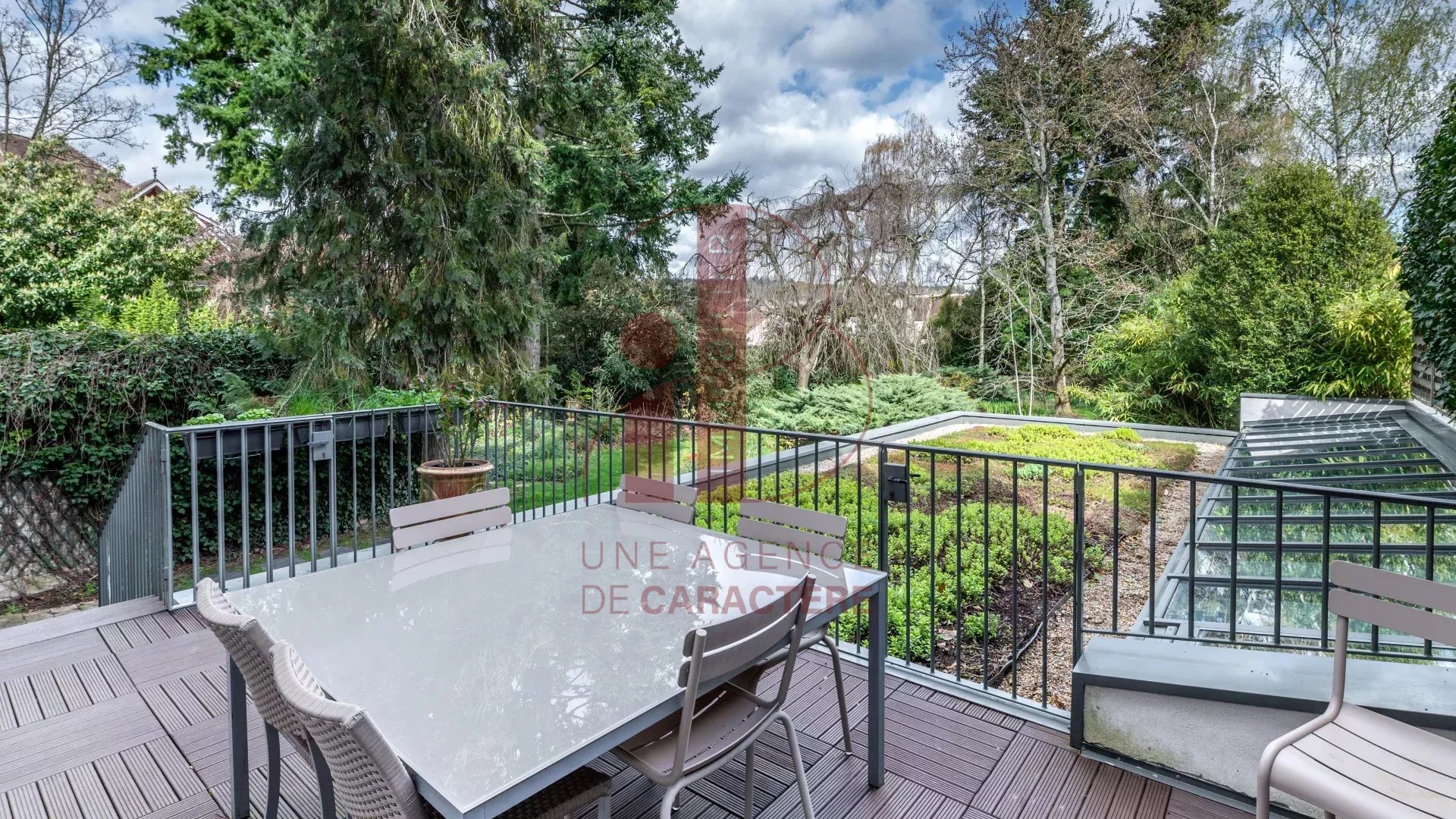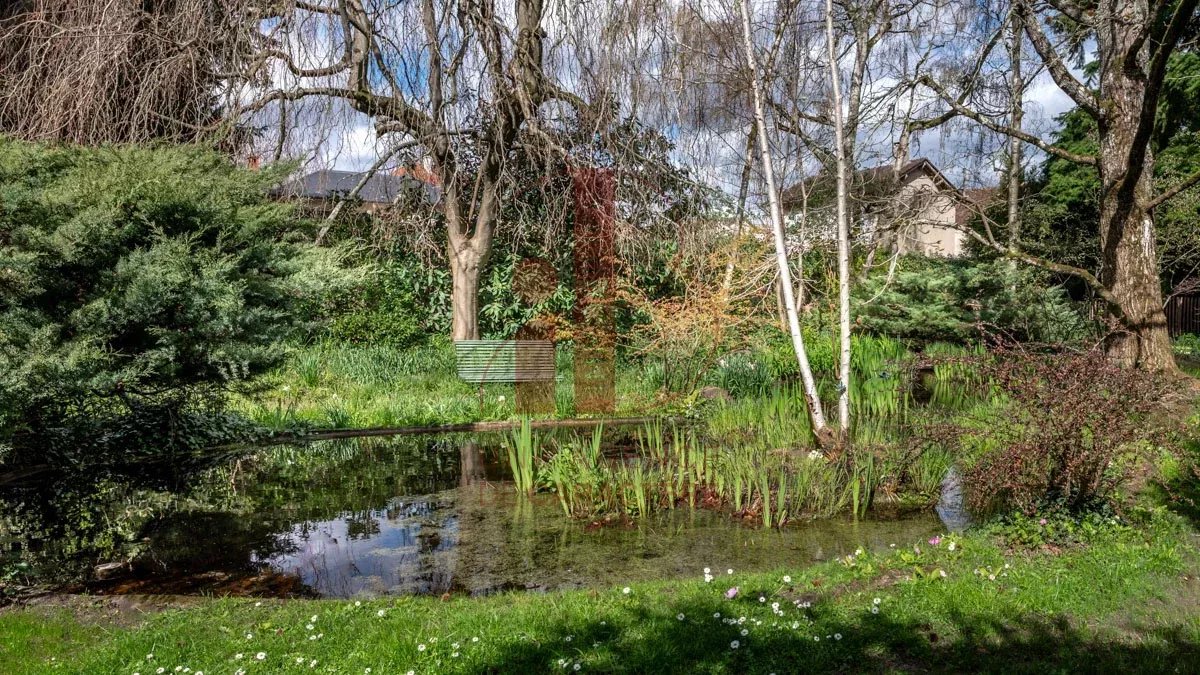 A l'arrière, un JARDIN EXCEPTIONNEL de 1.650m² offrant différentes atmosphères, une pièce d'eau entourée de végétation verdoyante, le liquidambar au feuillage mordoré, un hêtre pleureur, les douglas, les différents bouleaux, le cornouillé et les haies composées de différentes essences d'azalées, de rhododrindrons apportent de belles couleurs en toute saison et invitent à la détente et au dépaysement.