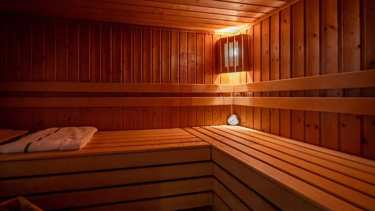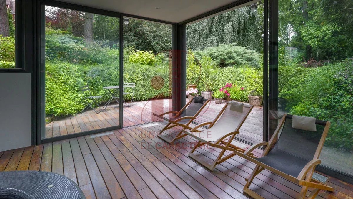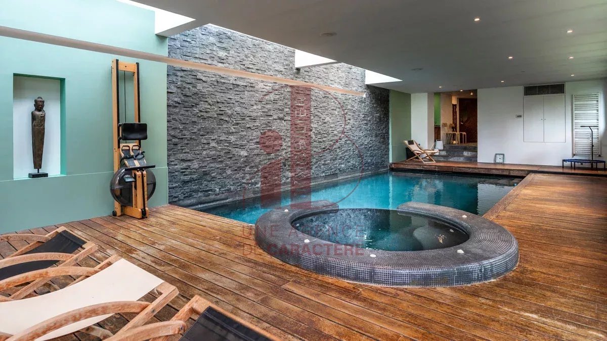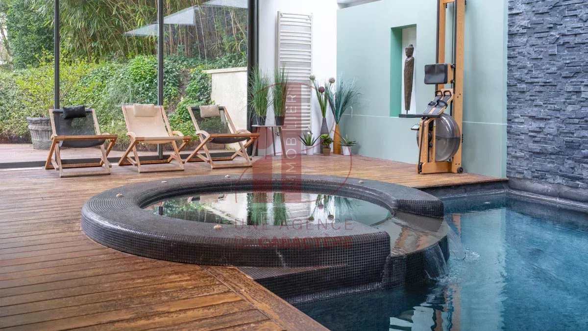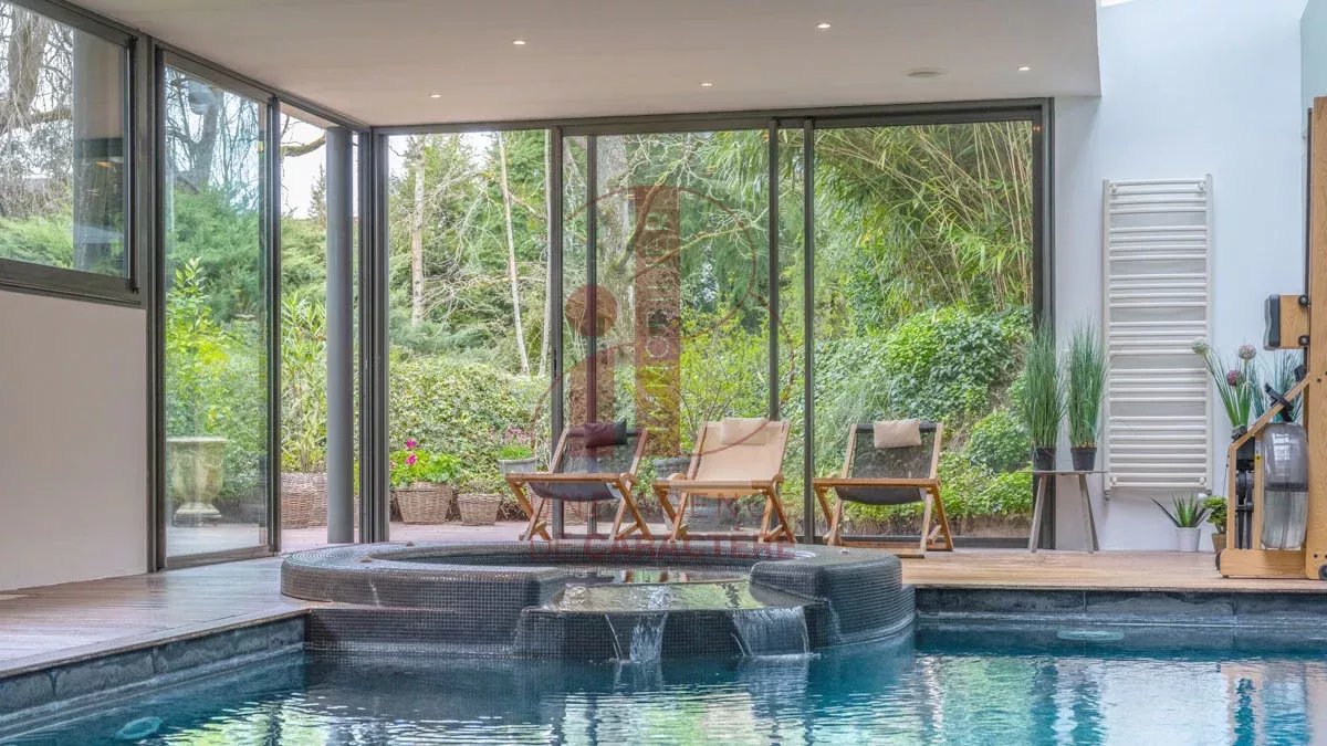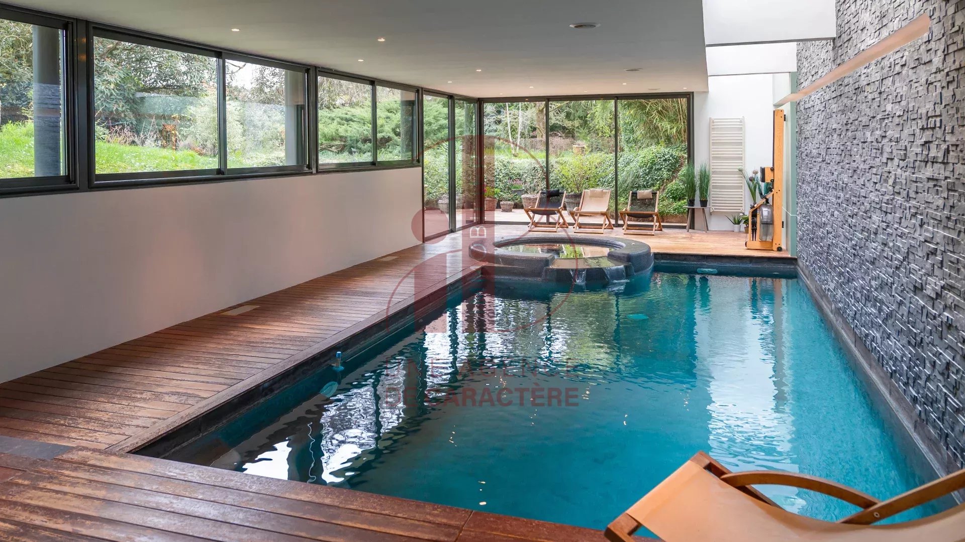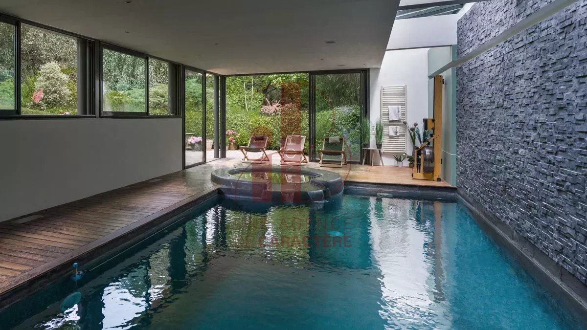L'extension de la maison de 90m² se fond dans le jardin et offre un confort supplémentaire avec cette piscine couverte, espace sport, sauna, jacuzzi avec un vestiaire et une douche à l'italienne.