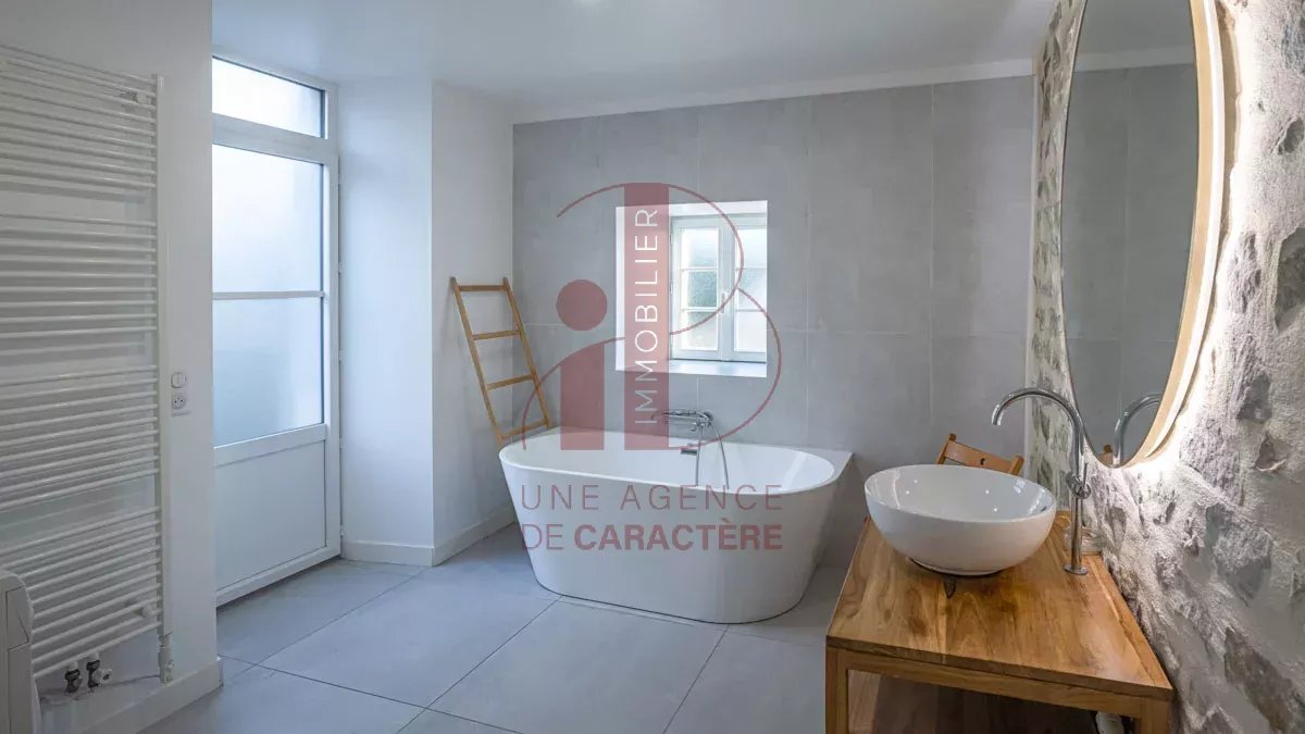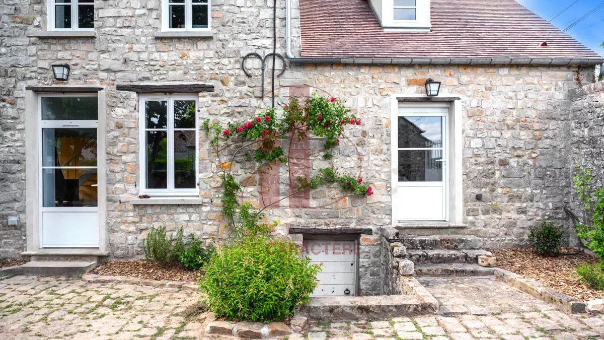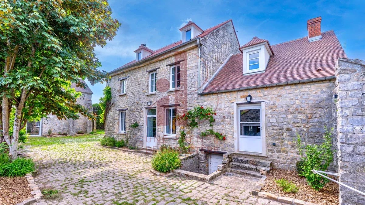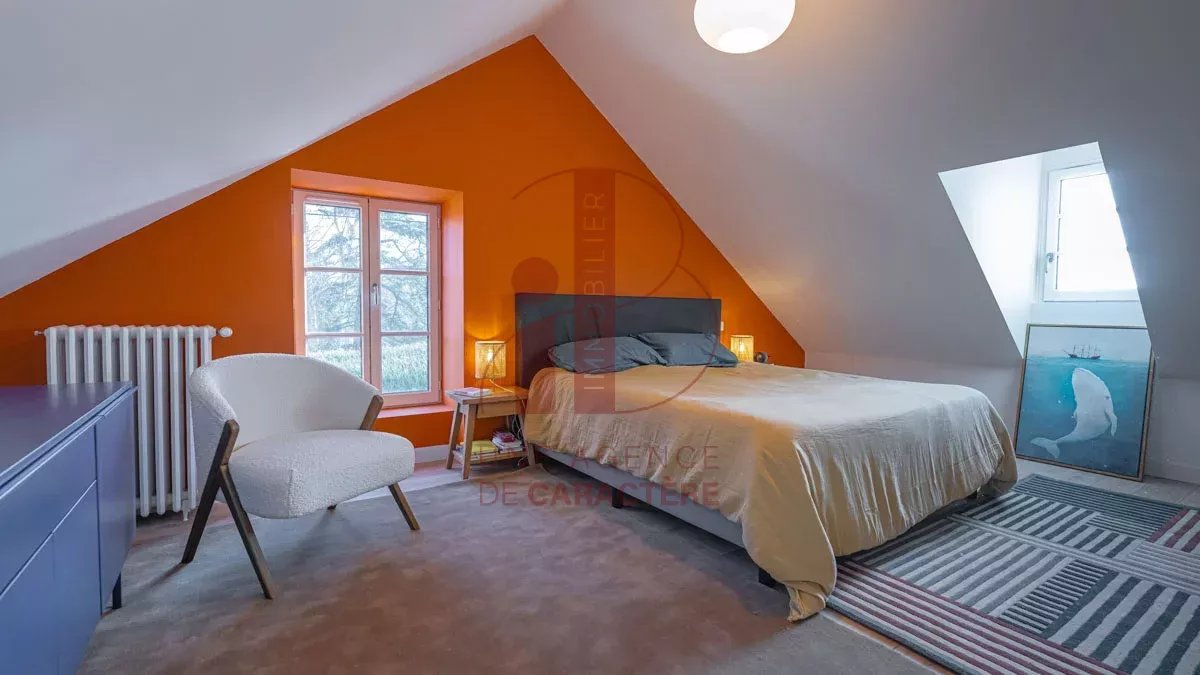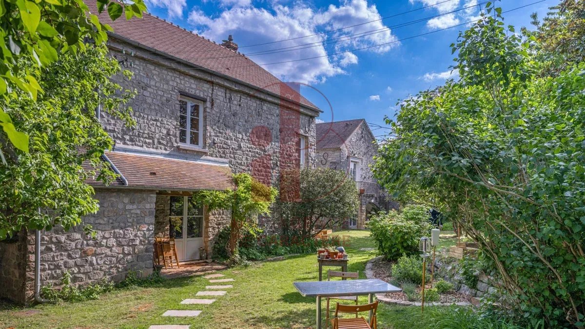 Une élégante cour pavée dessert une LONGERE d'environ 212 m² avec dépendances de 167 m² profite d'une vue dégagée sur la nature, entourée d'un terrain de 1.070 m² paysager et entierrement clos de murs avec cave voûtée.