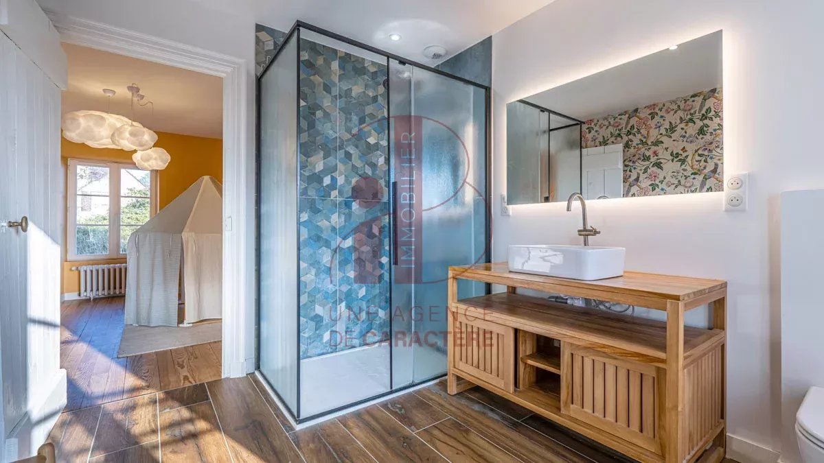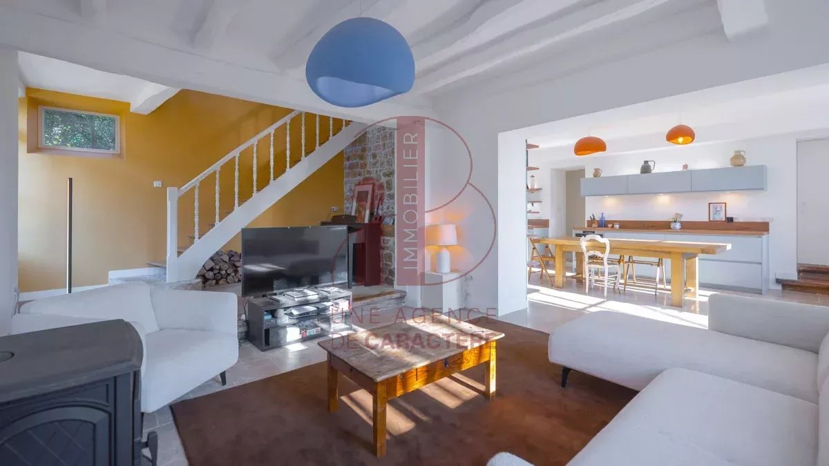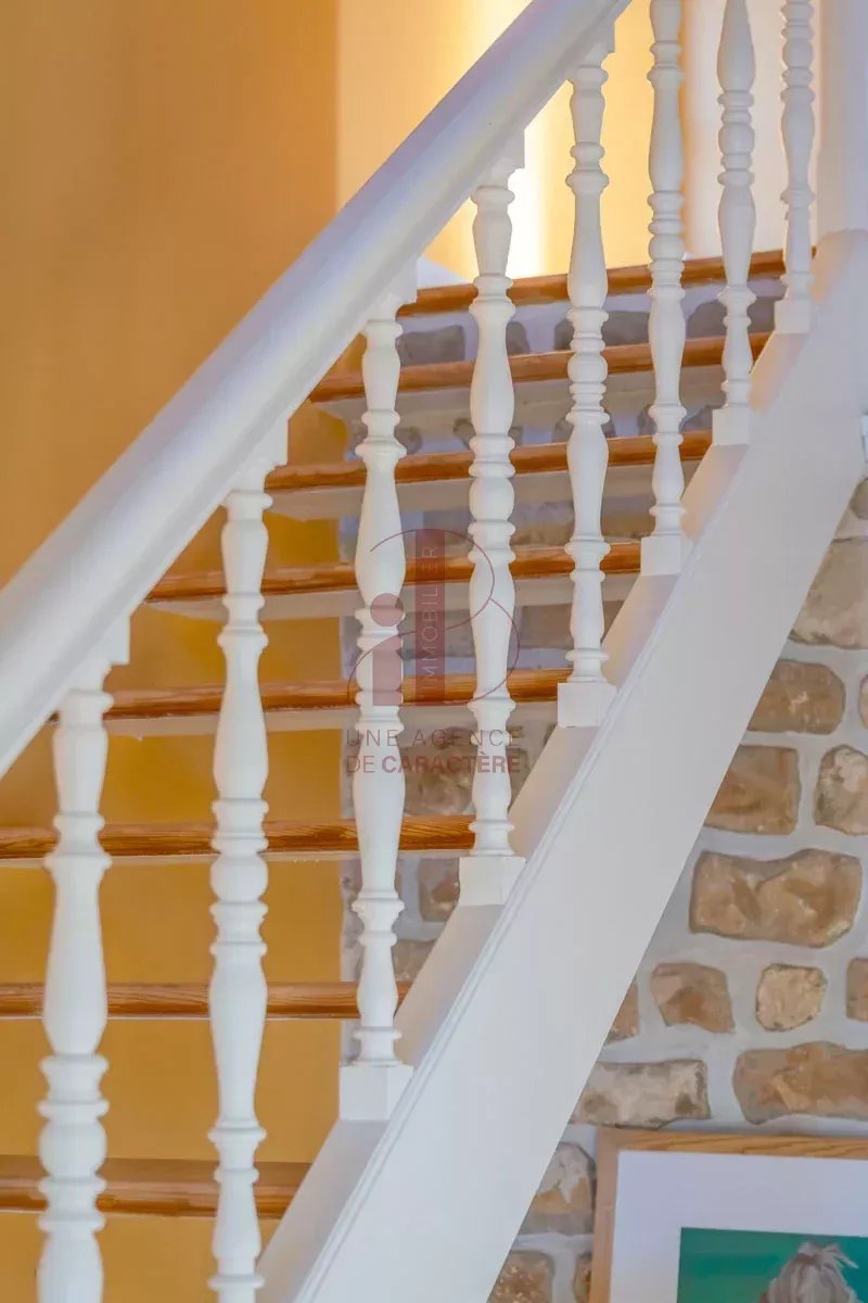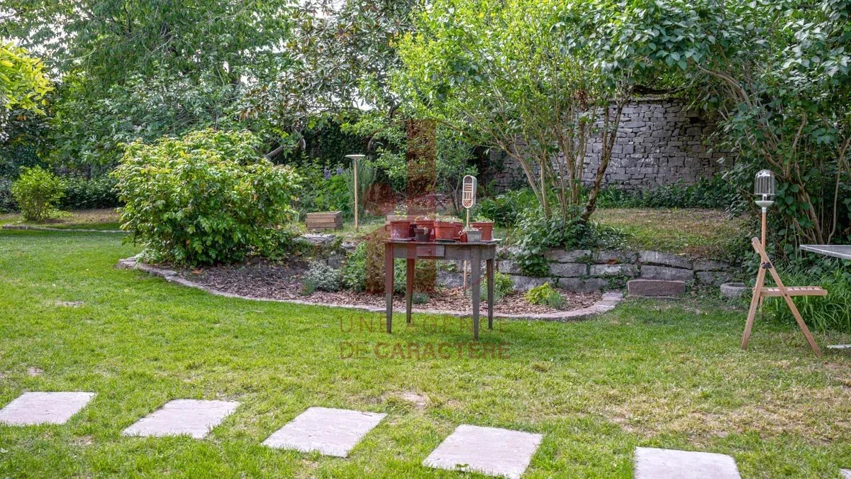 Une élégante cour pavée dessert une LONGERE d'environ 212 m² avec dépendances de 167 m² profite d'une vue dégagée sur la nature, entourée d'un terrain de 1.070 m² paysager et entierrement clos de murs avec cave voûtée.