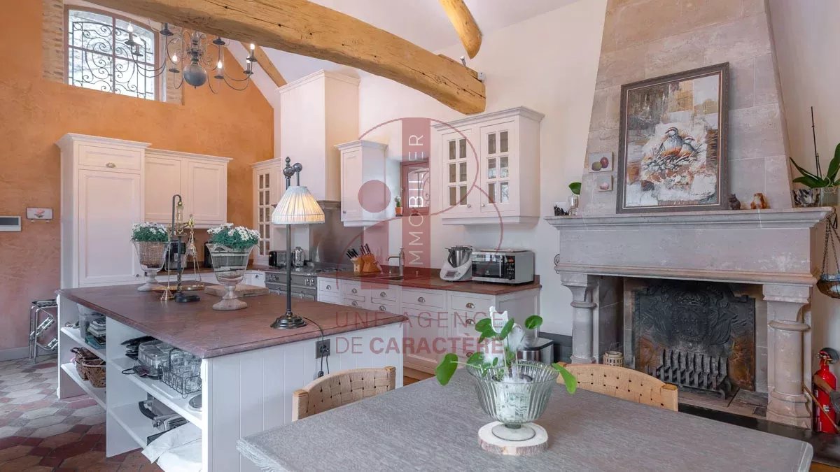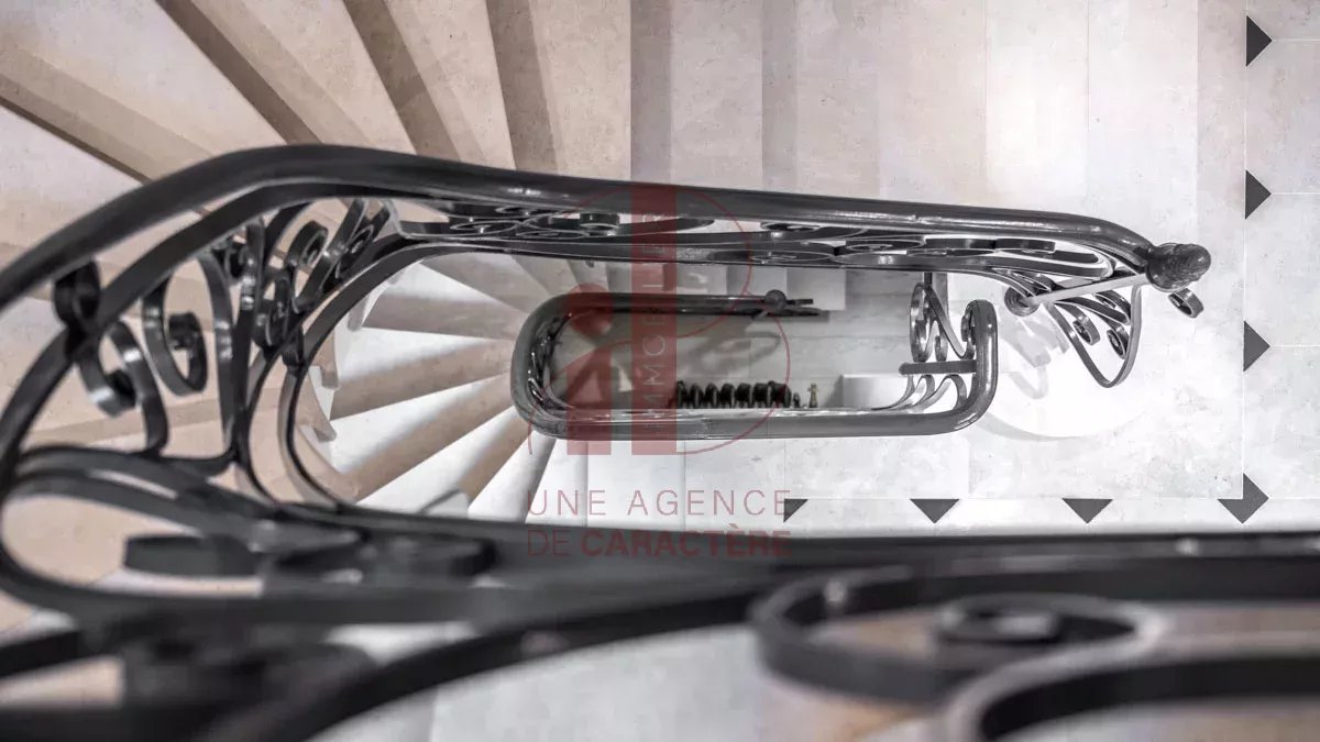 Elle comprend, au rez-de-chaussée, une VASTE ENTREE CATHEDRALE et traversante, un GRAND SALON agrémenté d'une cheminée XVIIIe, un PETIT SALON avec bibliothèque, une SALLE A MANGER, une CUISINE DINATOIRE cathédrale avec cheminée, un BUREAU avec accès à la terrasse, une pièce dite "volière" dotée d'un ASCENSEUR.