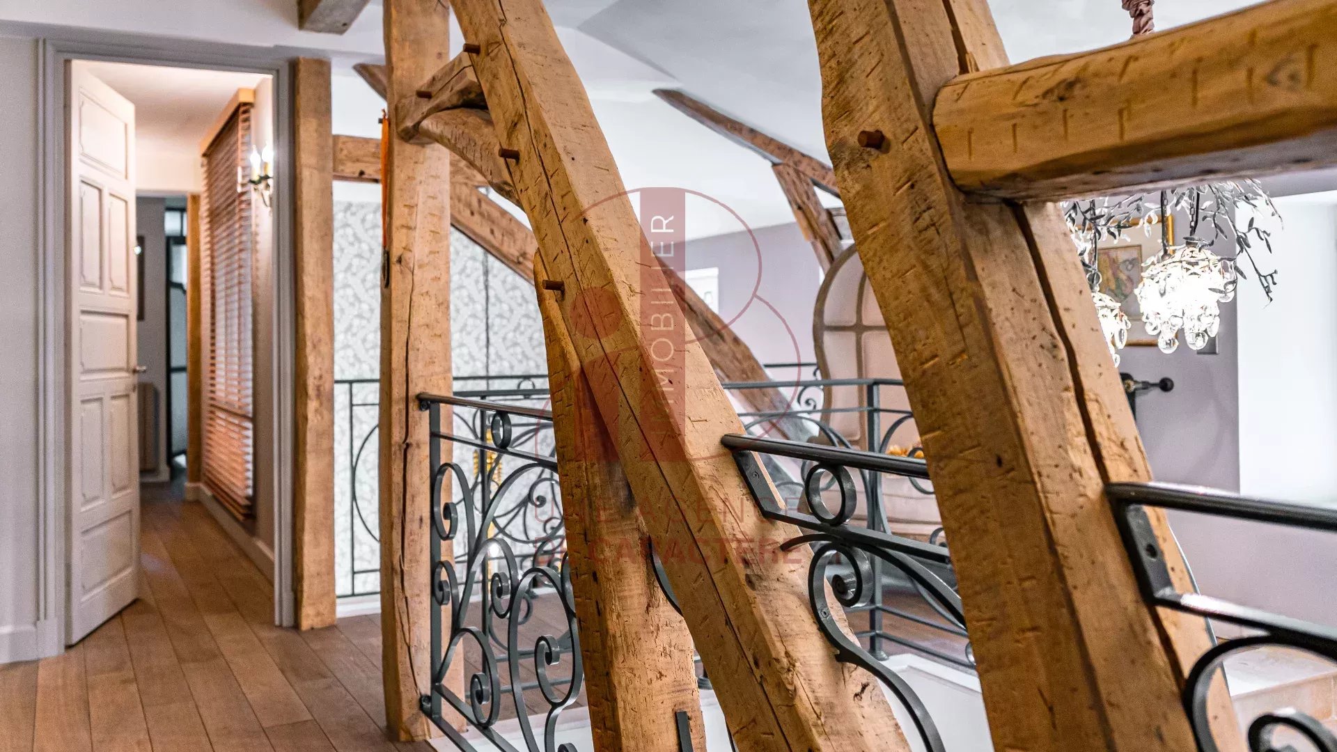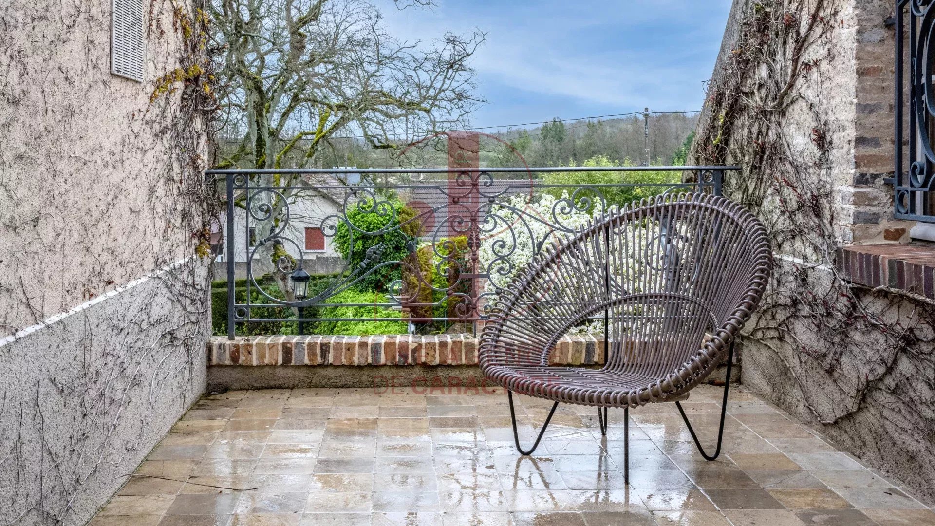 À l'étage, un escalier en pierre de Bourgogne avec balustrade en fer forgé réalisé par un artisan d'art mène à un palier desservant DEUX CHAMBRES, une salle d'eau avec toilettes, et une SOMPTUEUSE SUITE PARENTALE comprenant un espace nuit profitant d'une terrasse, deux dressings, une salle de bains et une douche avec toilettes.